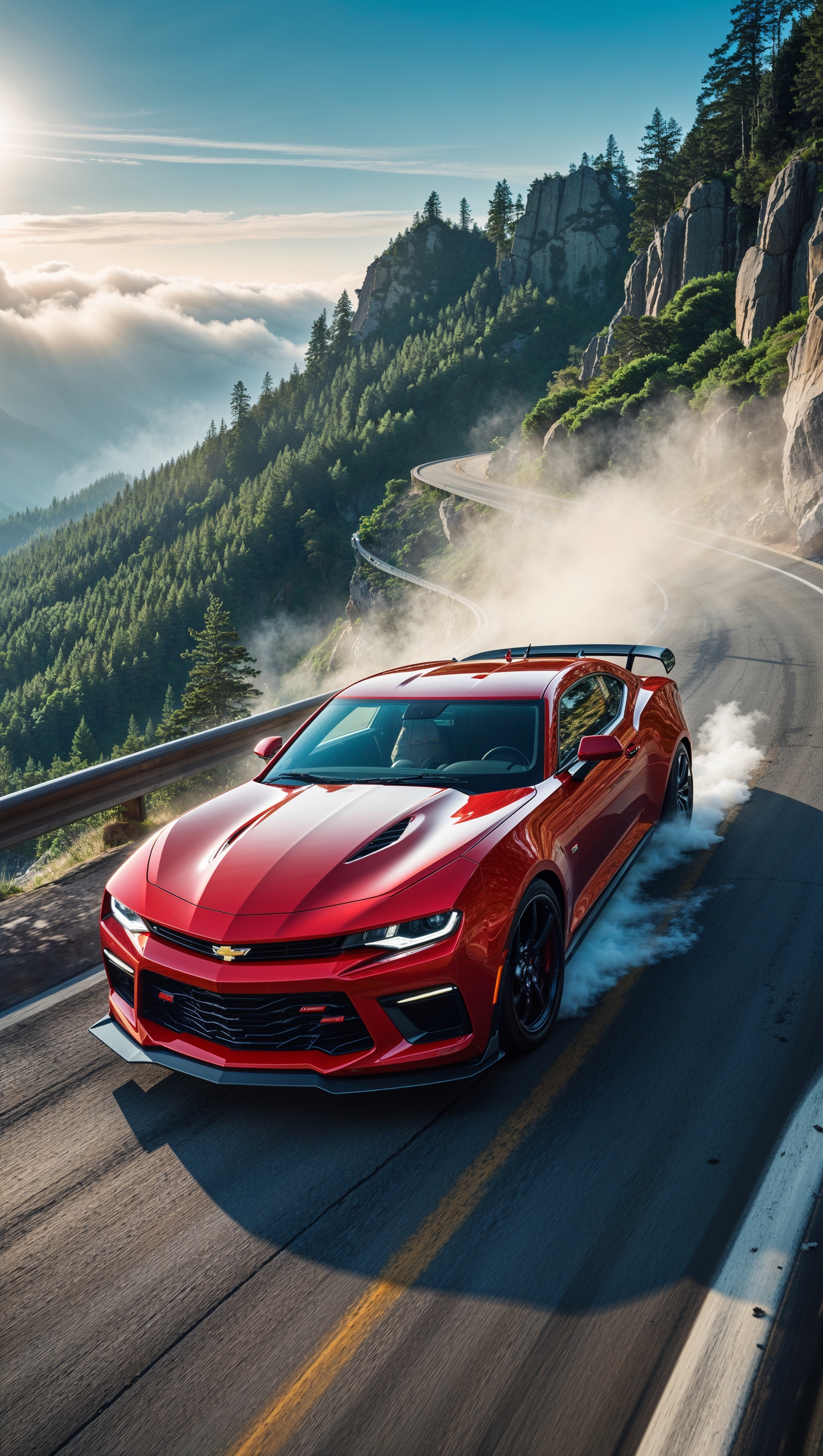 1664x2944 A red Chevrolet Camaro on a mountain road, perfect for iPhone wallpaper