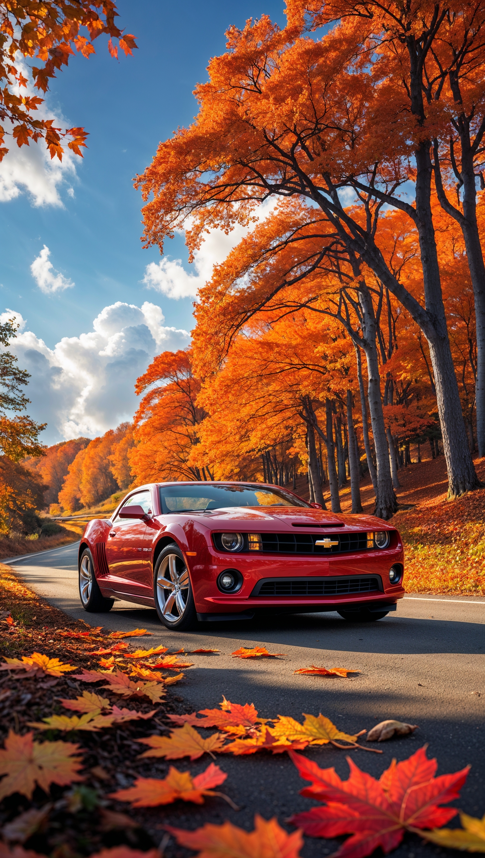 1664x2944 Camaro in an autumn landscape with orange and yellow leaves