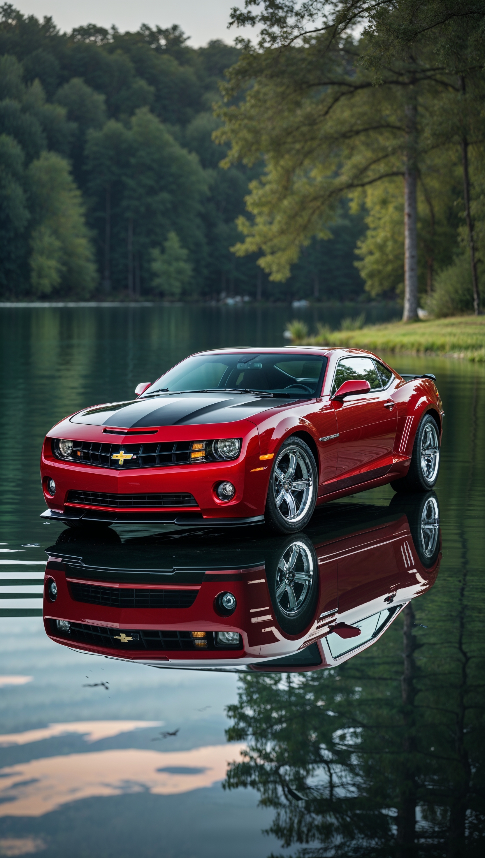 1664x2944 Camaro next to a calm lake with reflection in the water