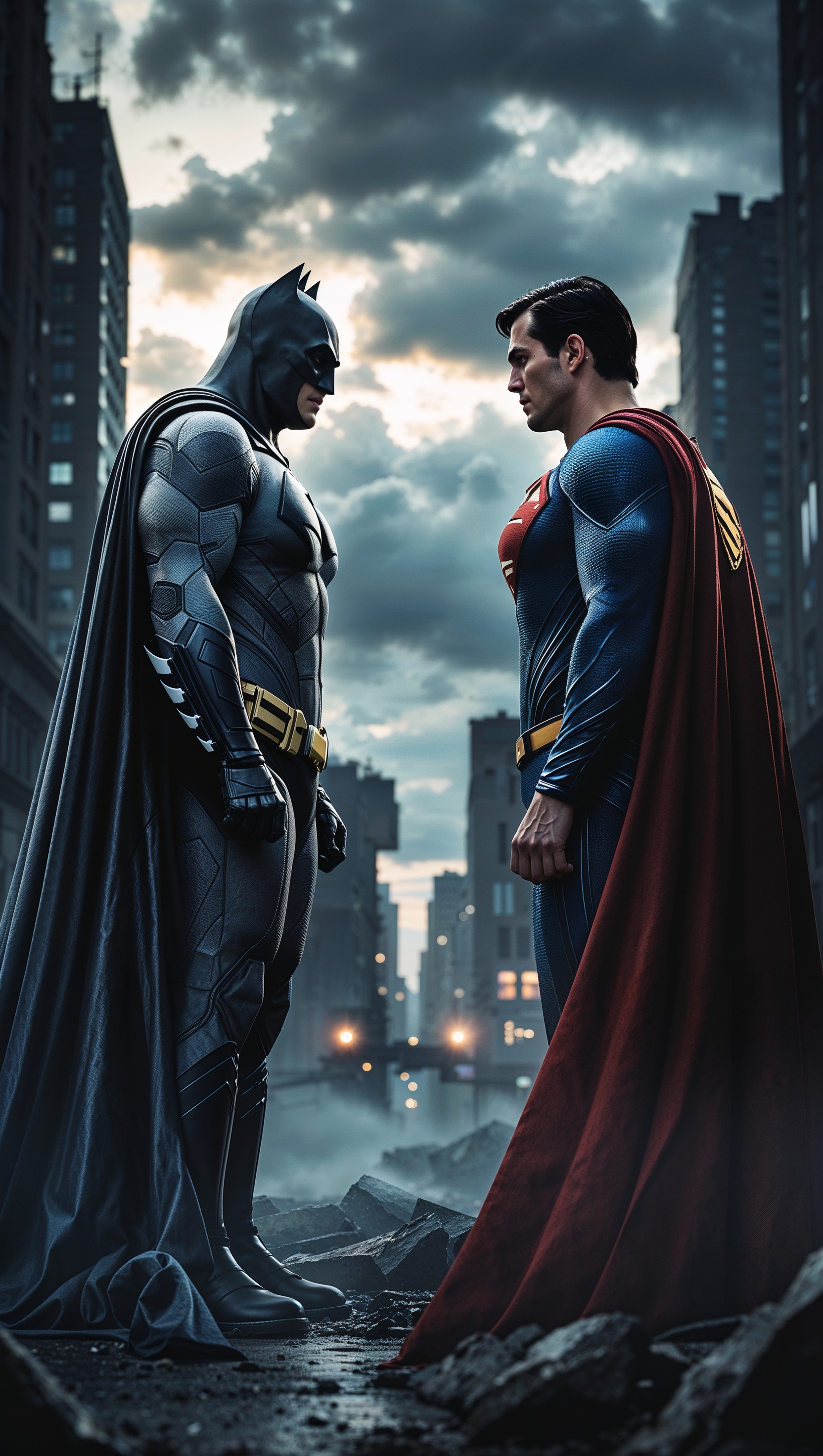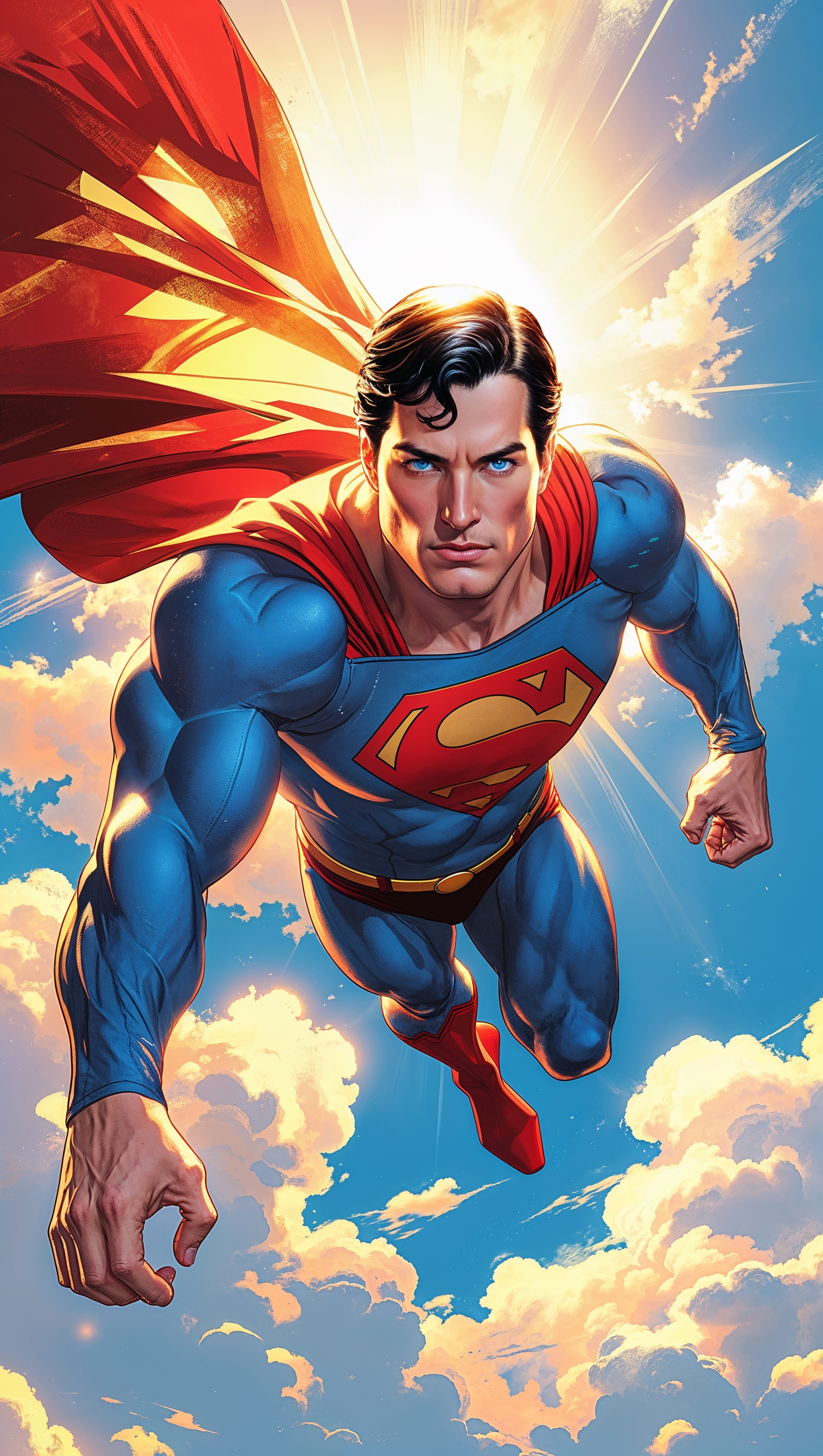 1664x2944 Superman flying in the sky with sunlight behind – cinematic style