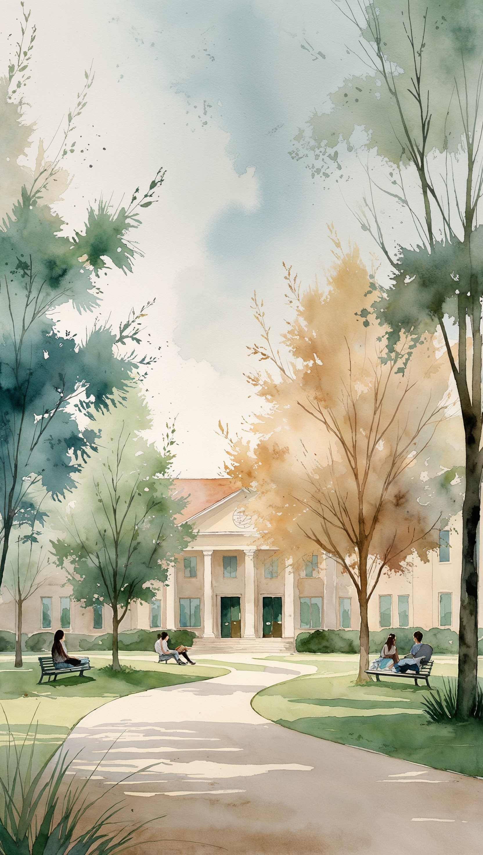 1664x2944 Craft an iPhone wallpaper using a watercolor painting style, with gentle effects and natural colors reminiscent of the university campus