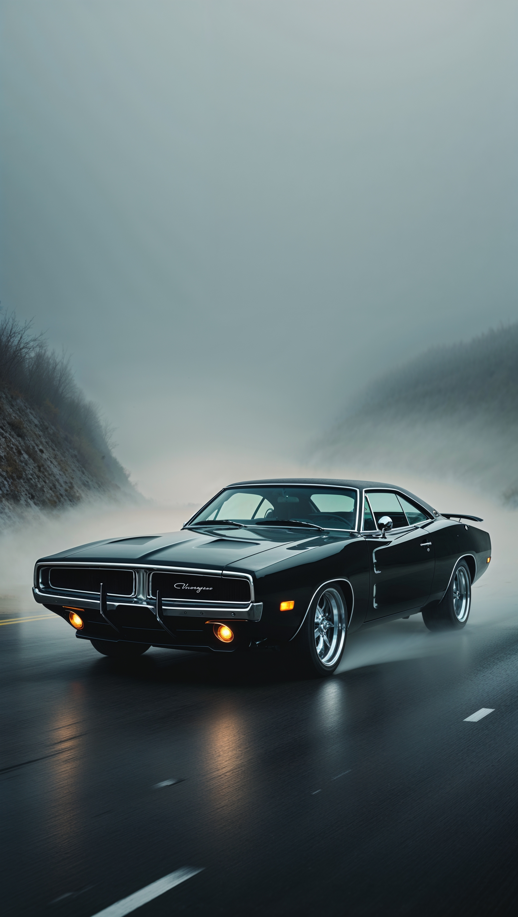 1664x2944 A Dodge Charger driving on an empty road with thick fog