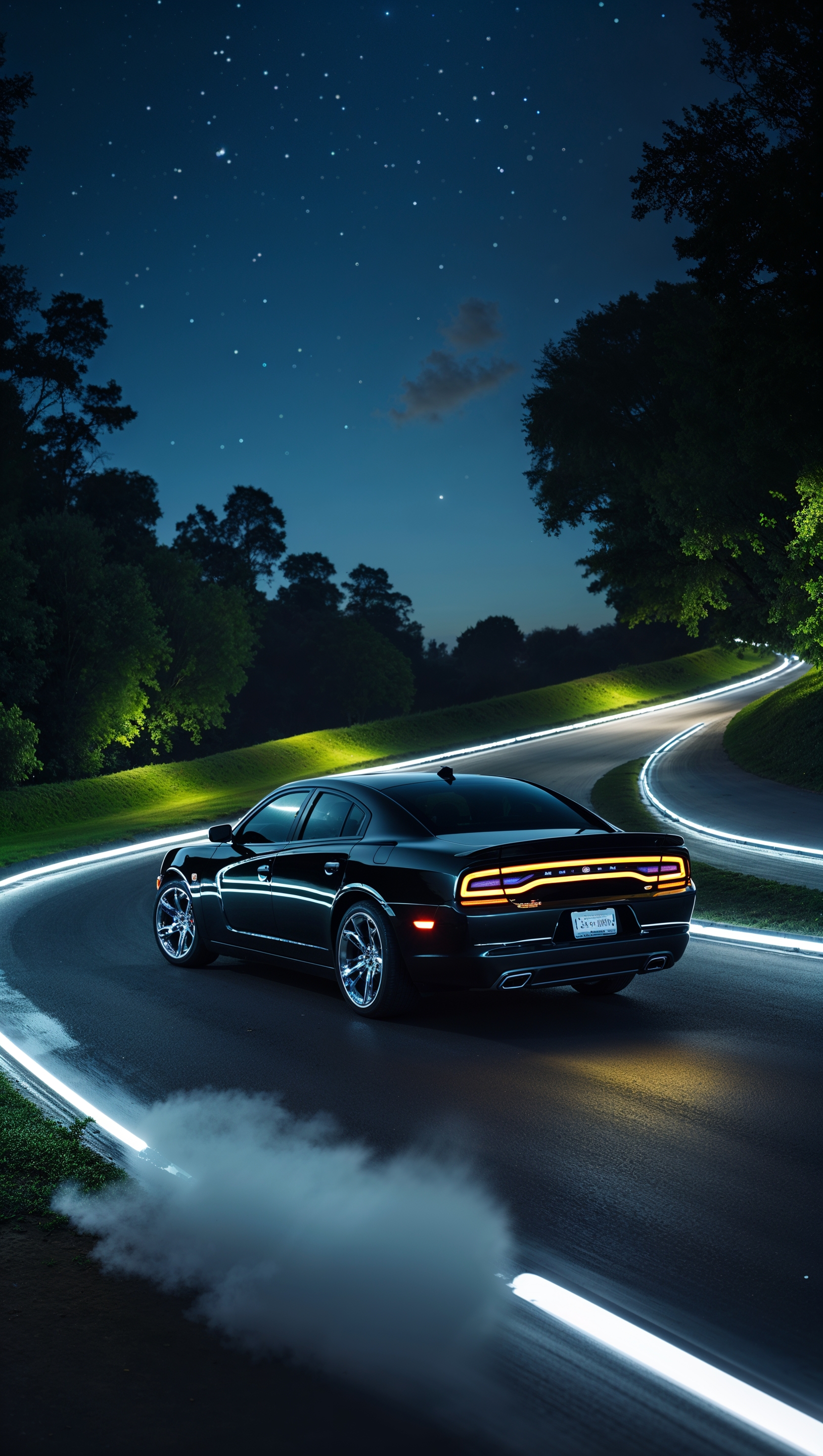1664x2944 A black Dodge Charger with cool lighting on a road at night