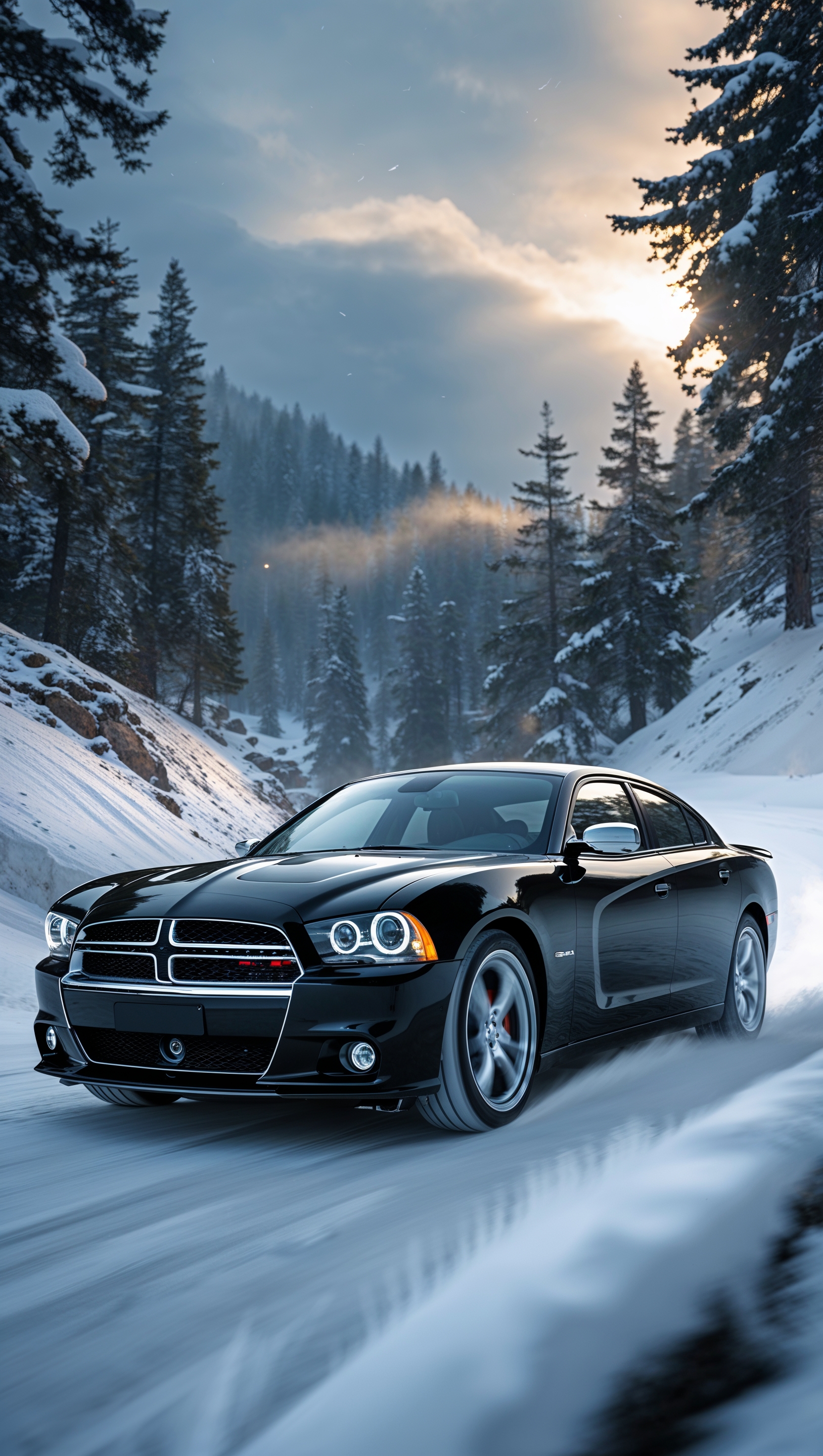 1664x2944 A Dodge Charger on a mountain road in bright daylight