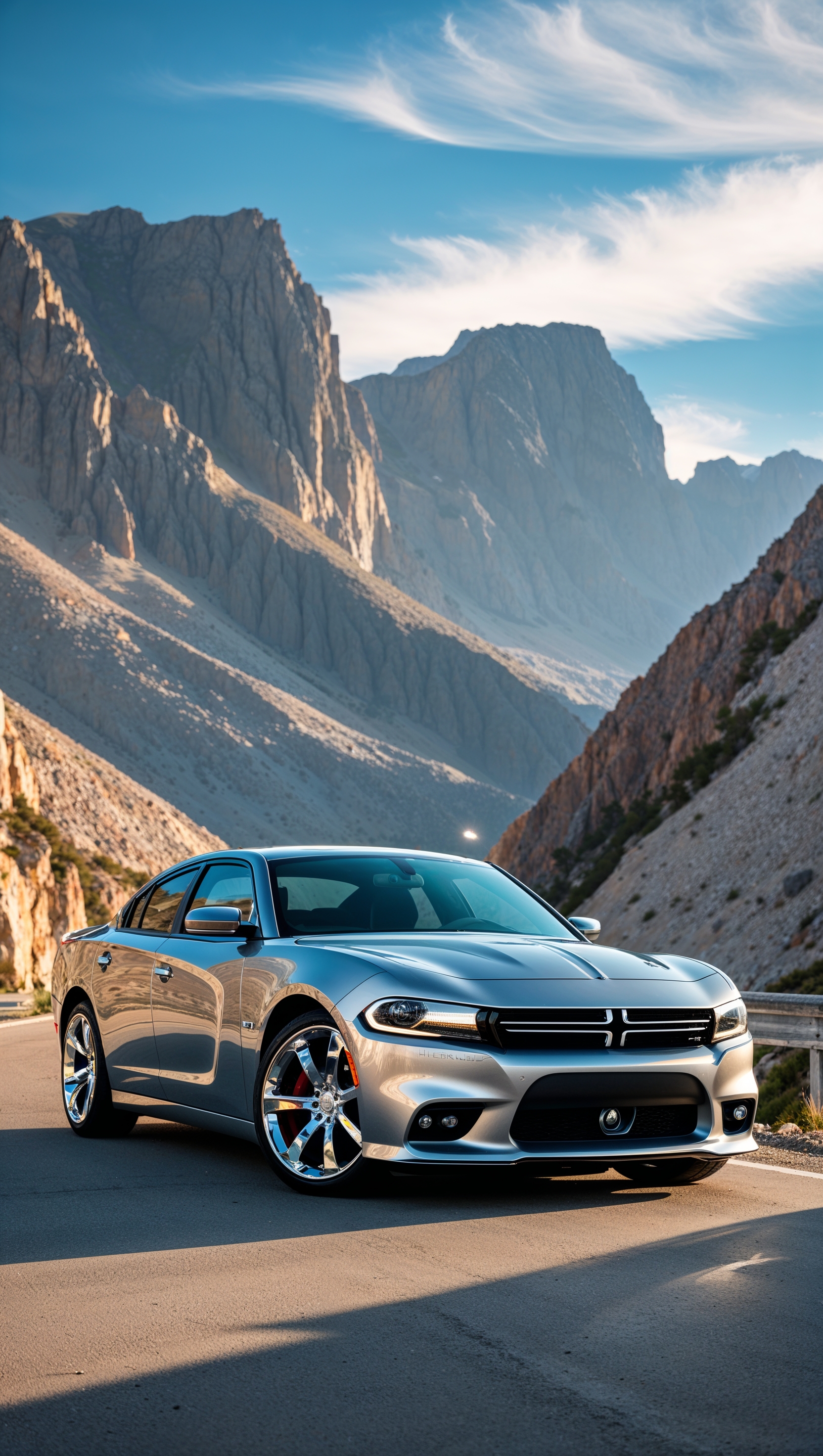 1664x2944 A metallic-colored Dodge Charger next to mountains in the daytime