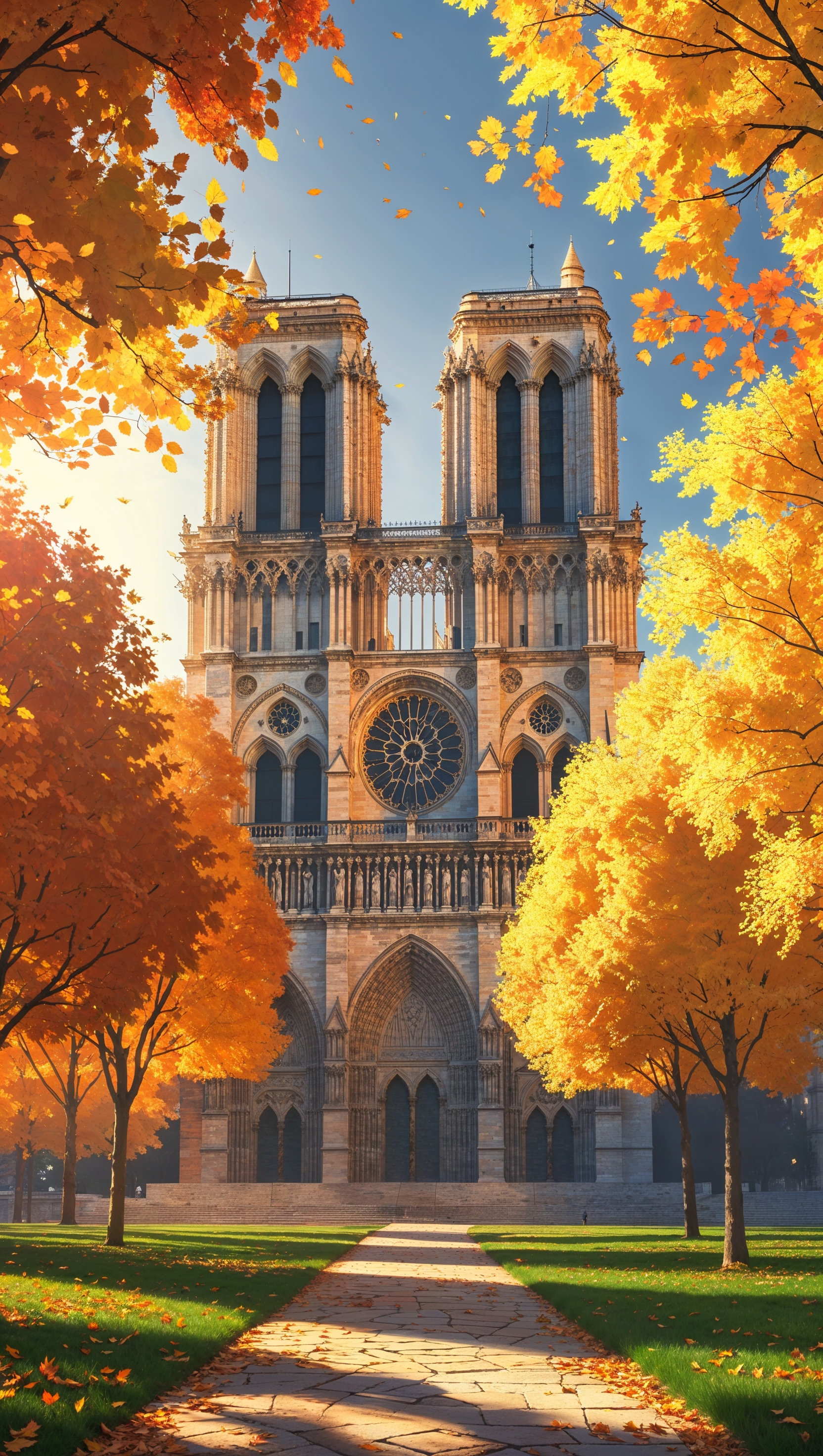 1664x2944 Notre Dame in autumn with yellow and orange trees around