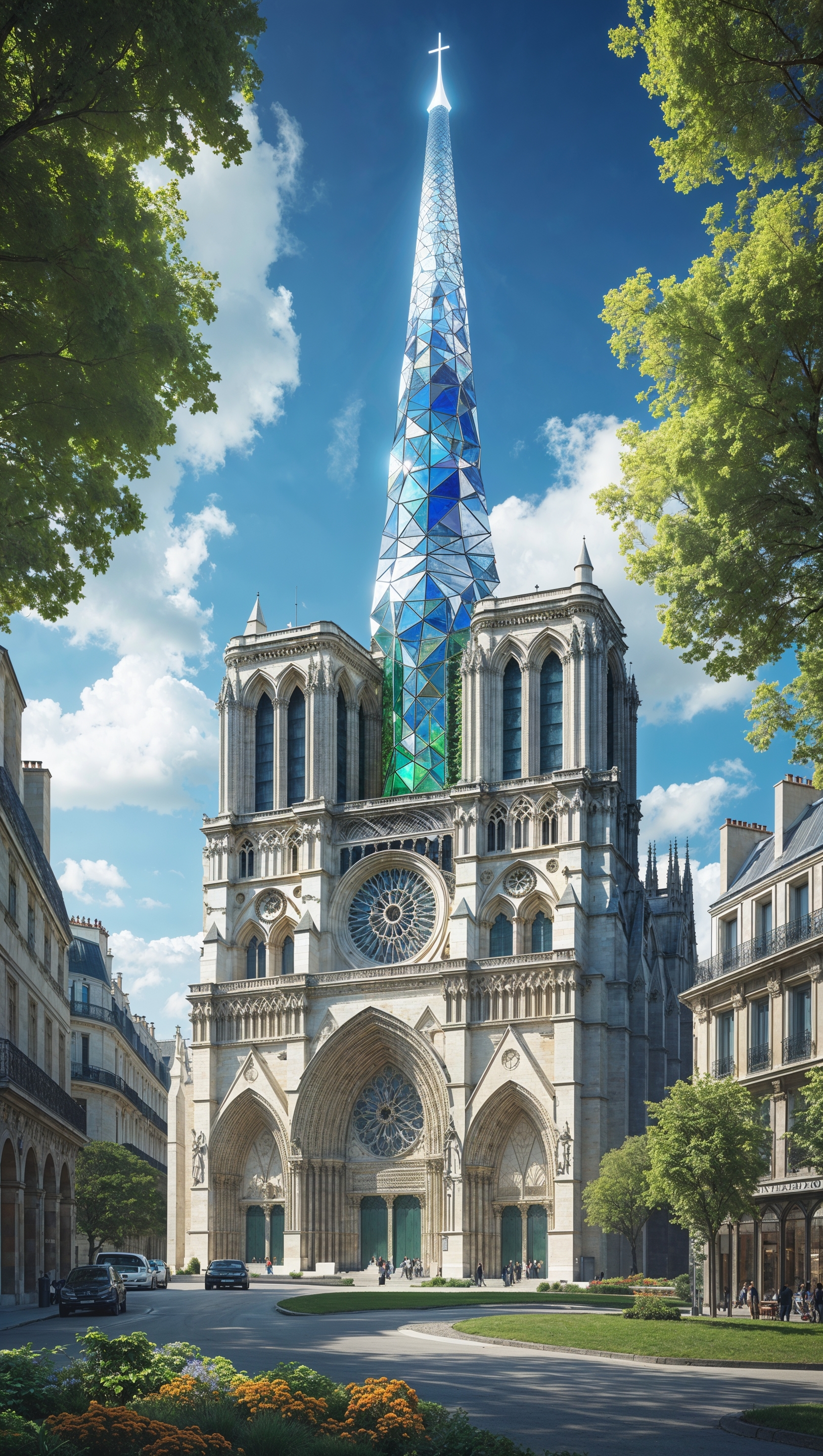 1664x2944 Notre Dame in summer with blue sky and white clouds
