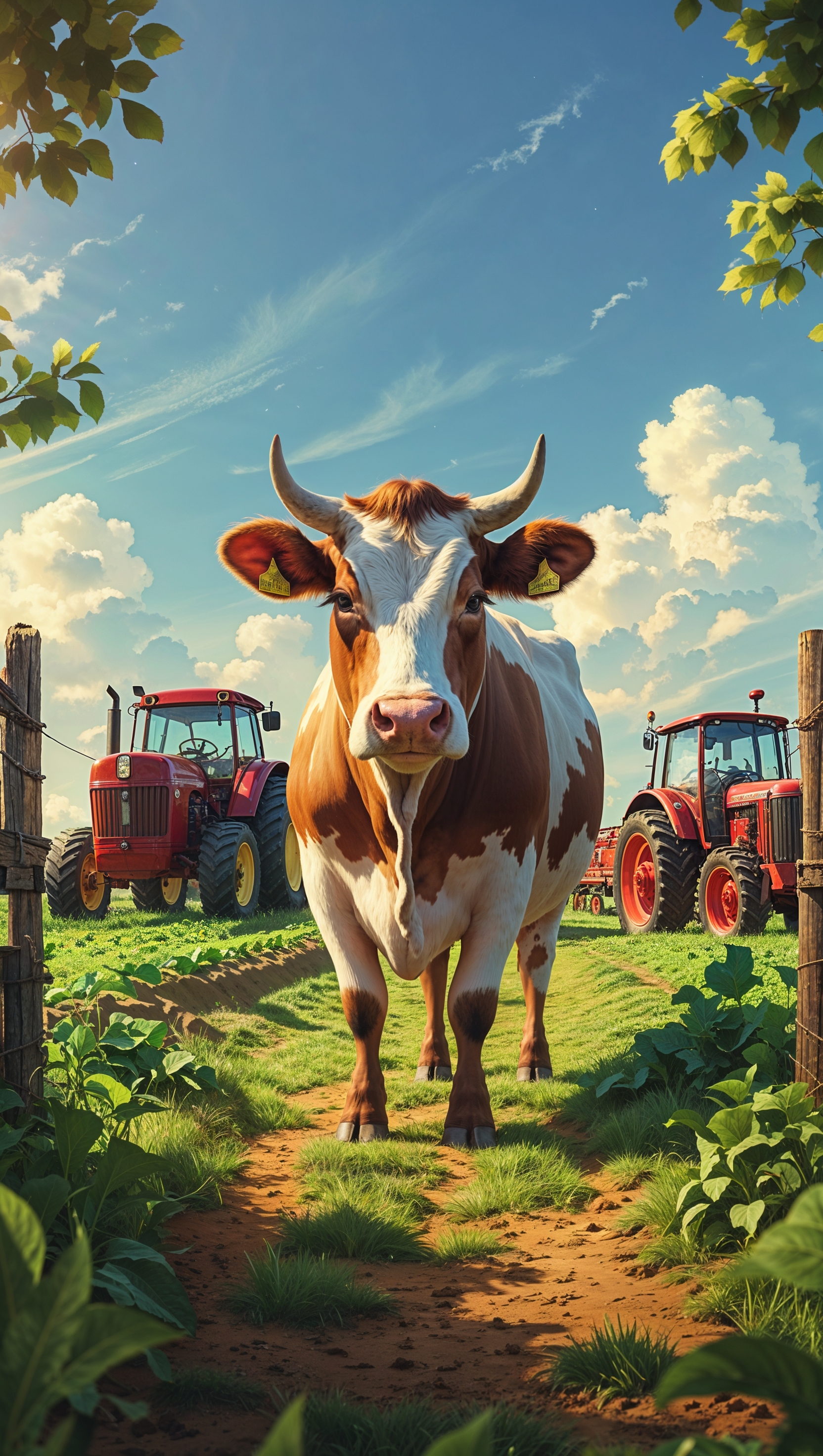 1664x2944 An artistic image of a cow in a farm with a blue sky and white clouds for an iPhone wallpaper