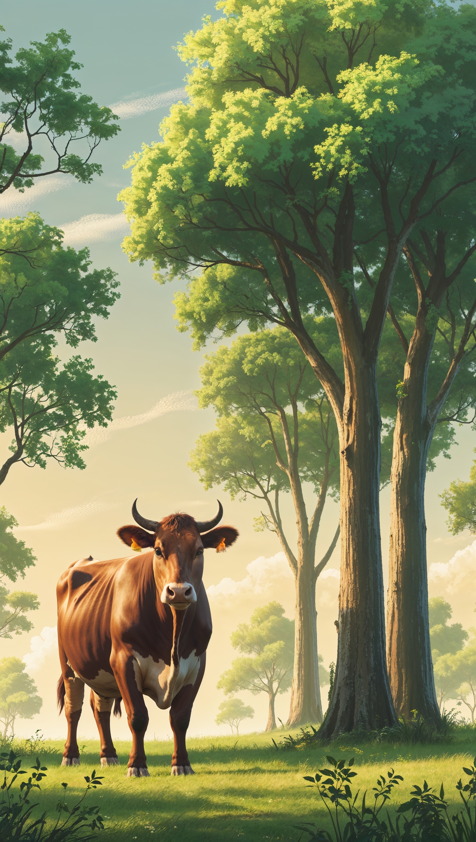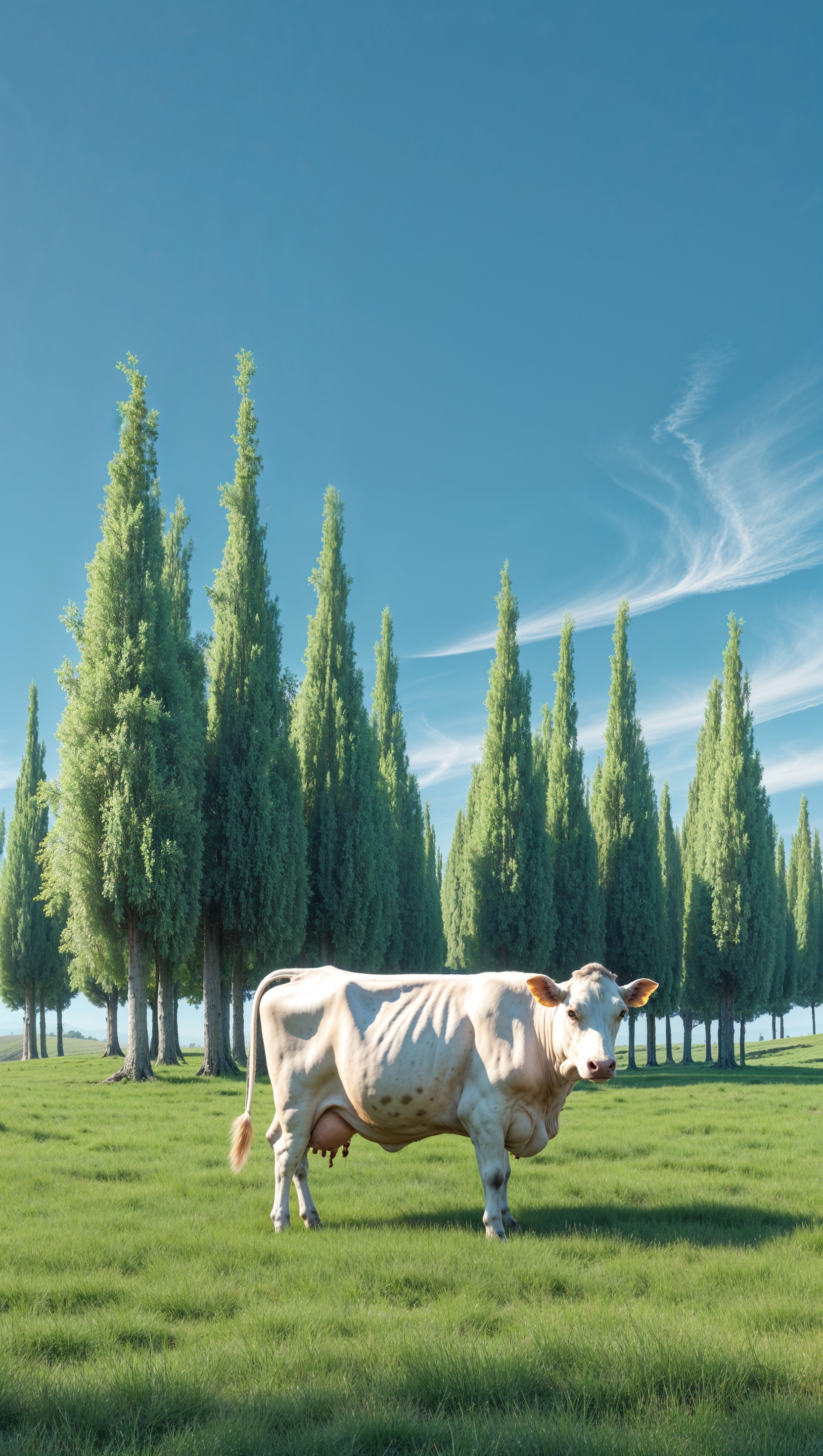 1664x2944 A calm cow next to tall trees with a clear blue sky for an iPhone wallpaper