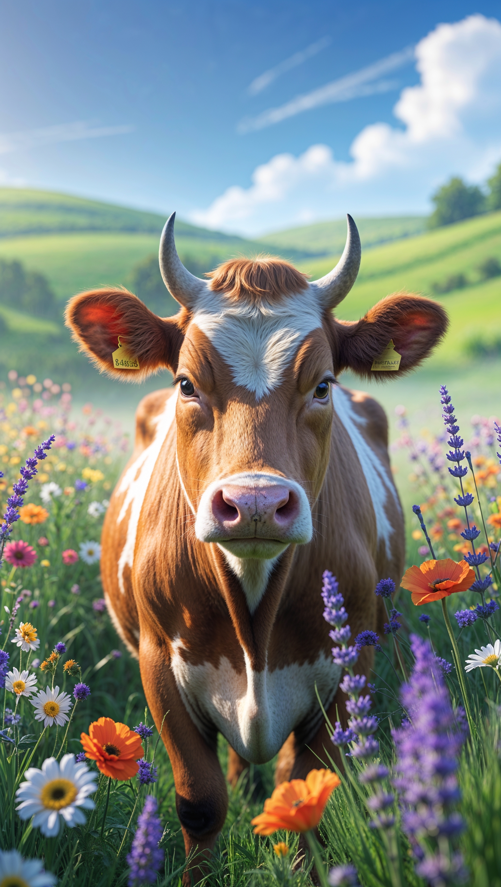 1664x2944 A cow next to a flower meadow and green fields for an iPhone wallpaper