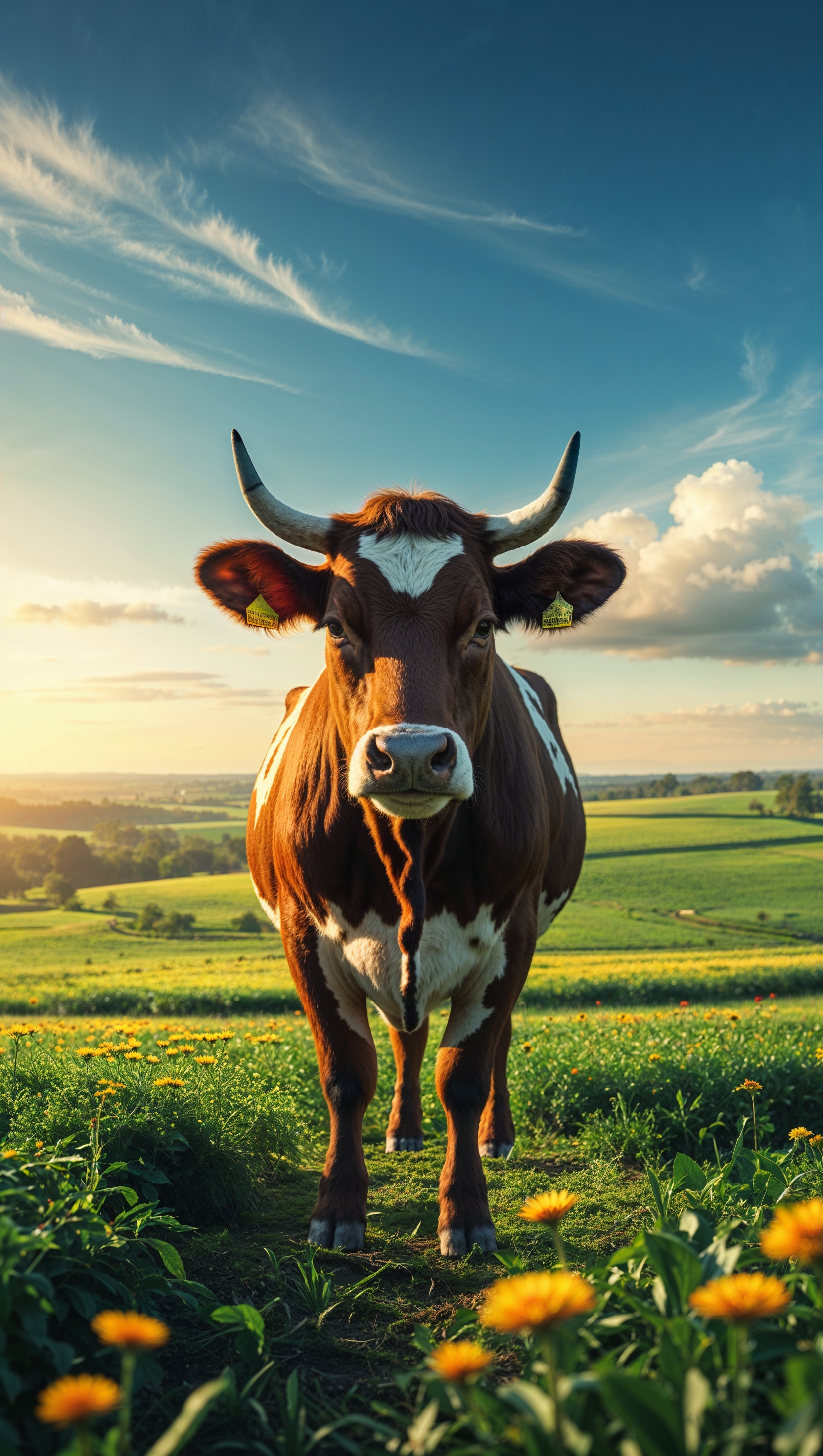 1664x2944 An image of a cow with wildflowers and agricultural fields for an iPhone wallpaper