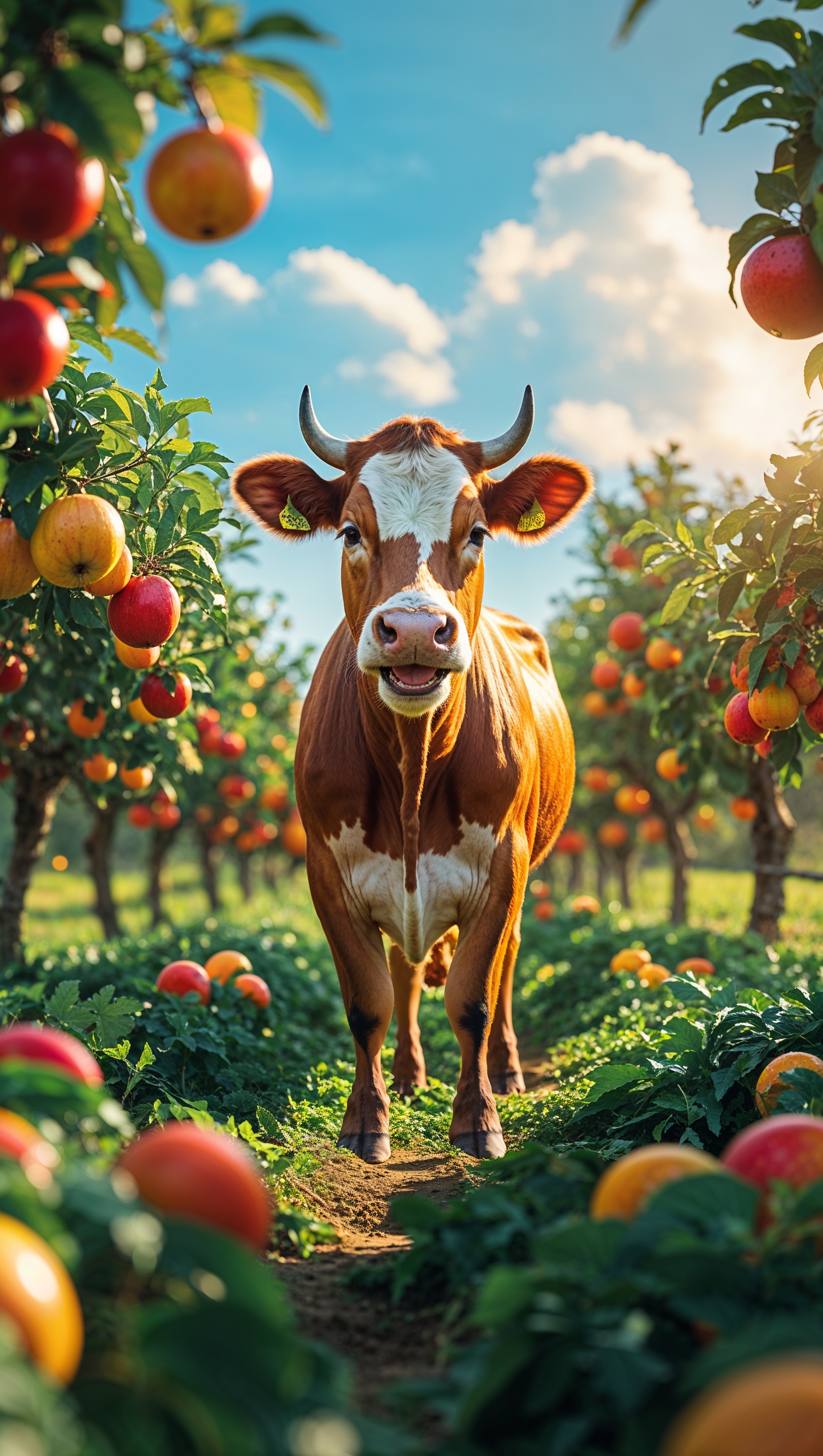 1664x2944 A happy cow in a farm with fruit-bearing trees for an iPhone wallpaper