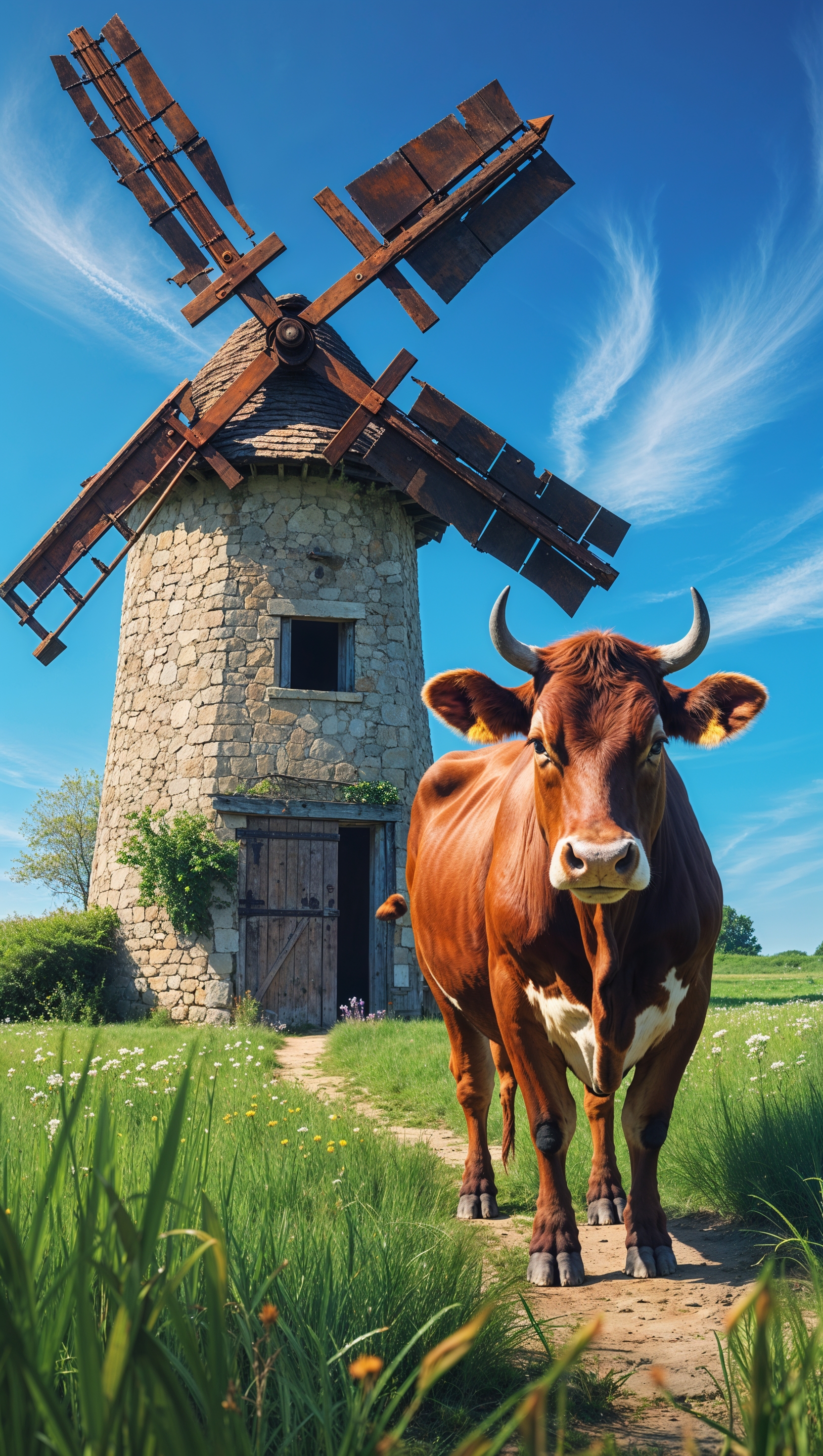 1664x2944 A cow next to an old windmill with a bright sky for an iPhone wallpaper