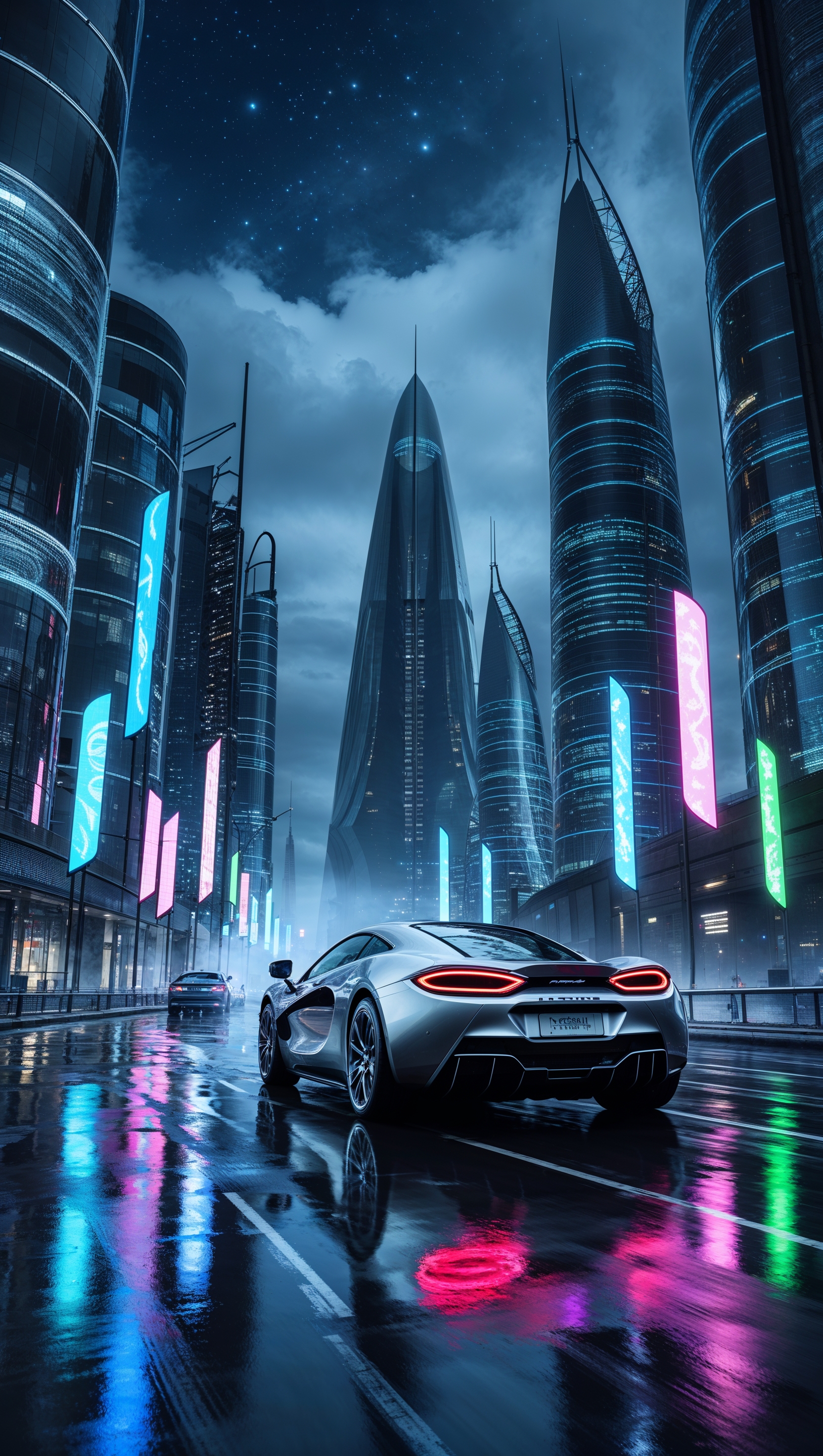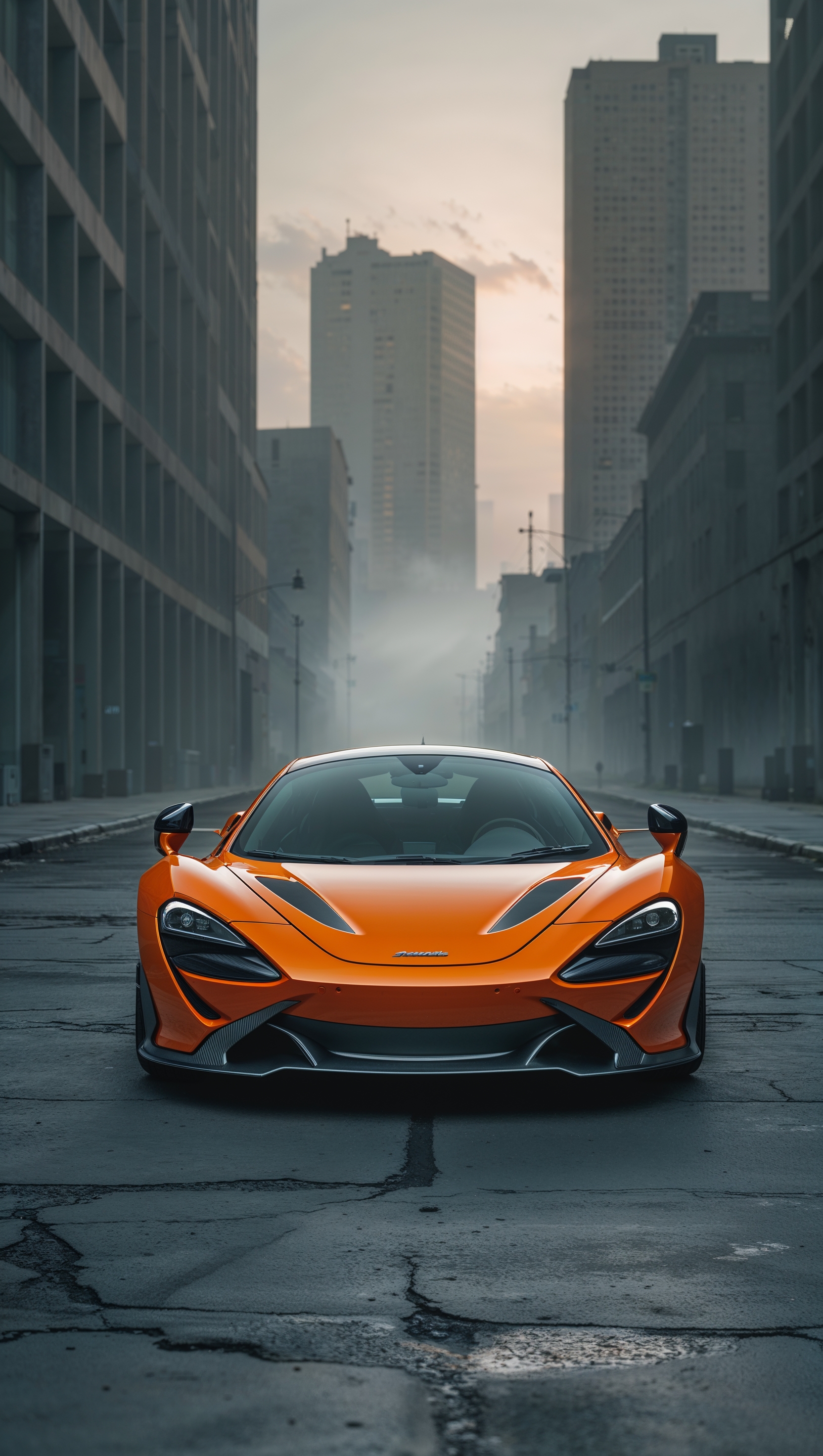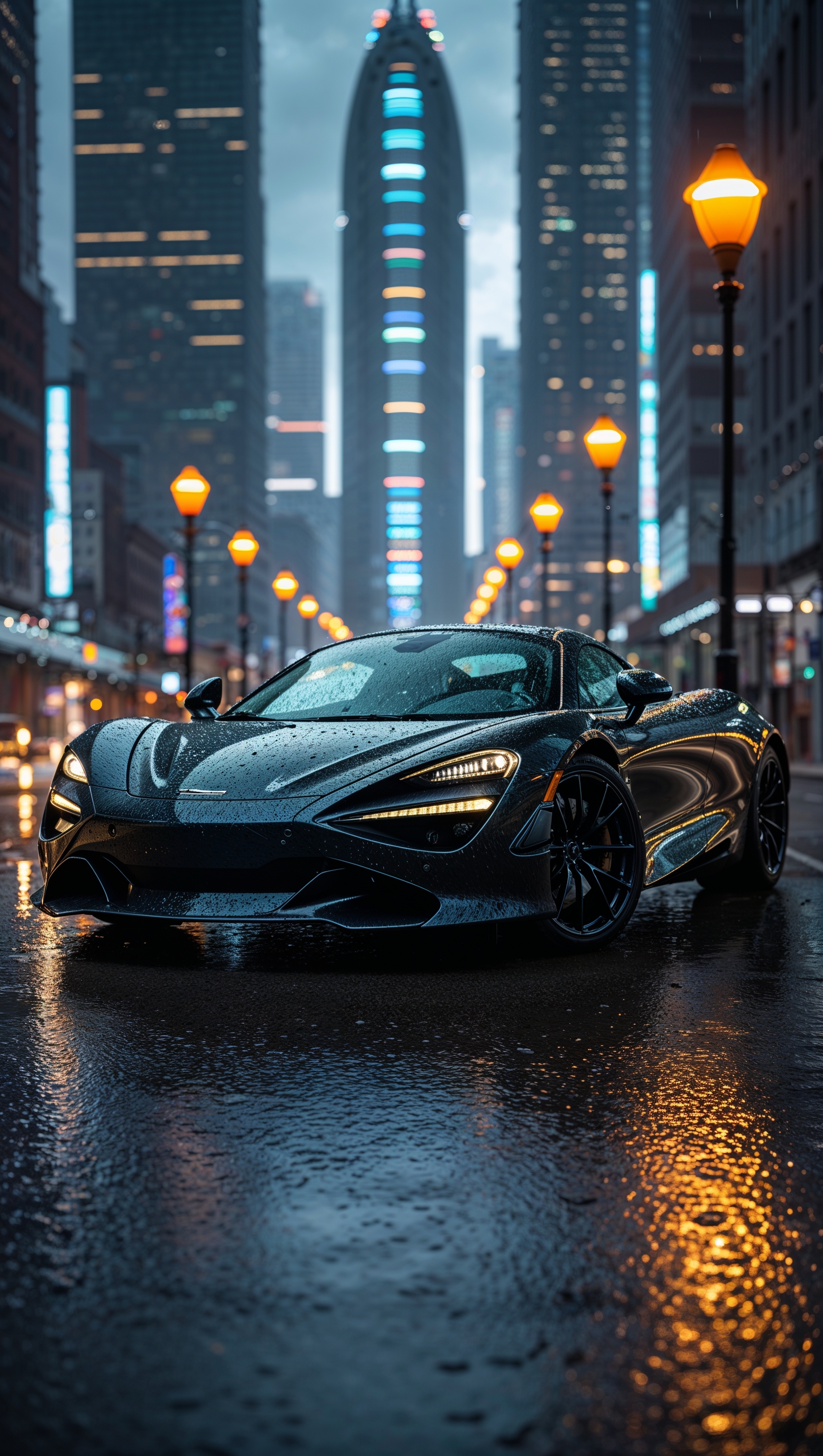 1664x2944 McLaren in a futuristic city with modern skyscrapers