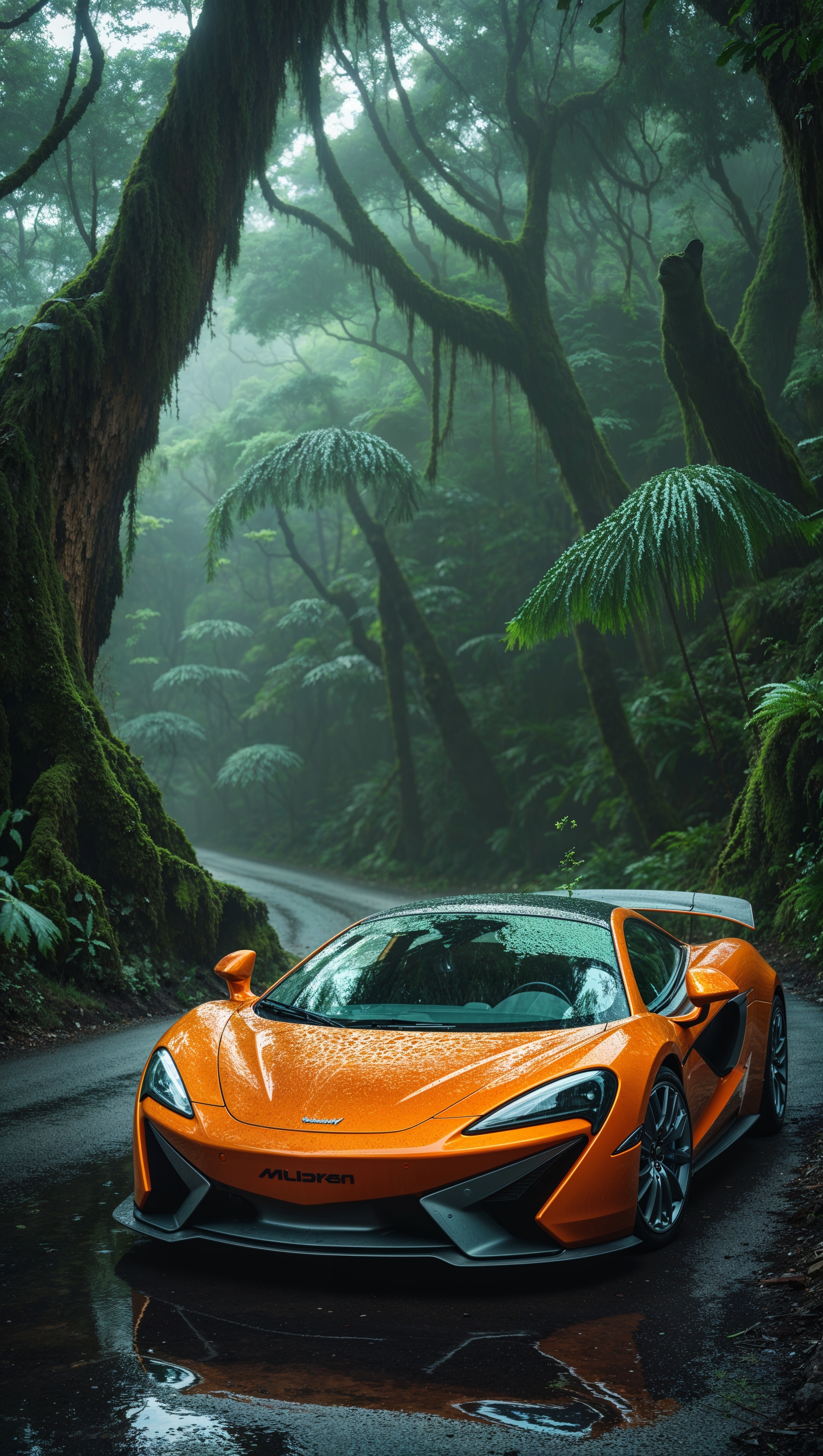 1664x2944 McLaren in a rainforest with mist and water droplets