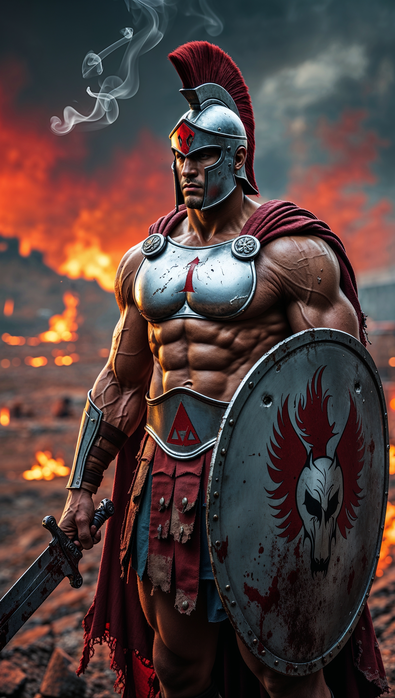 1664x2944 A Spartan standing in a battlefield with a fiery background