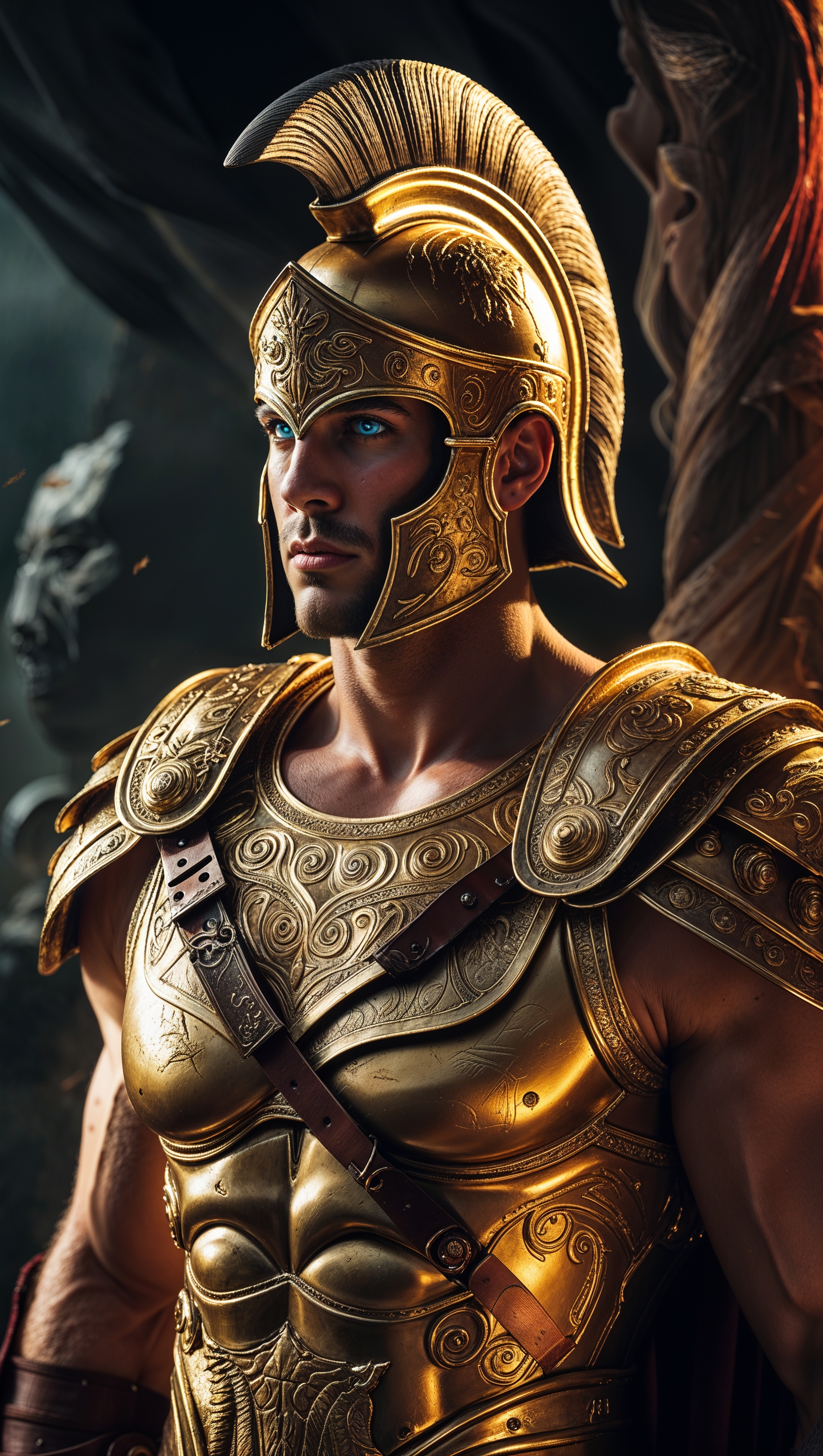 1664x2944 Close-up of a Spartan warrior with a golden helmet and dramatic lighting