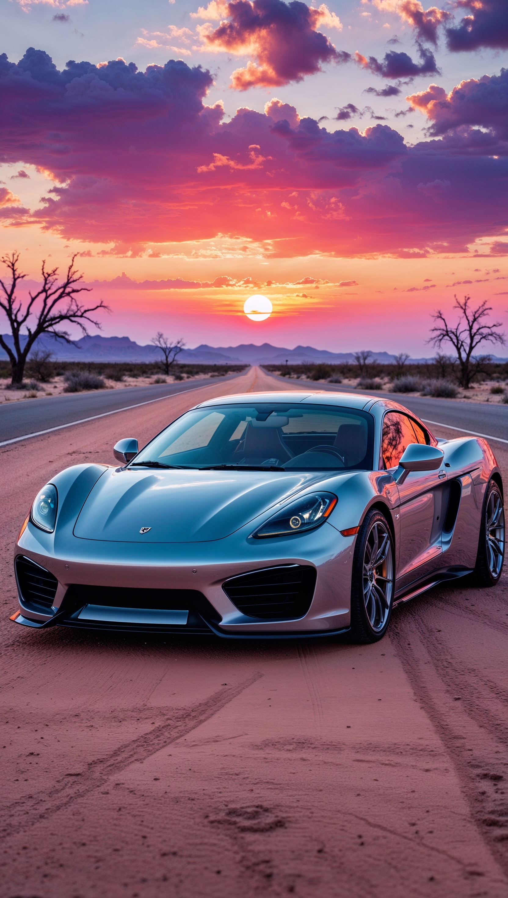 1664x2944 Car in the desert with a purple-orange sunset sky