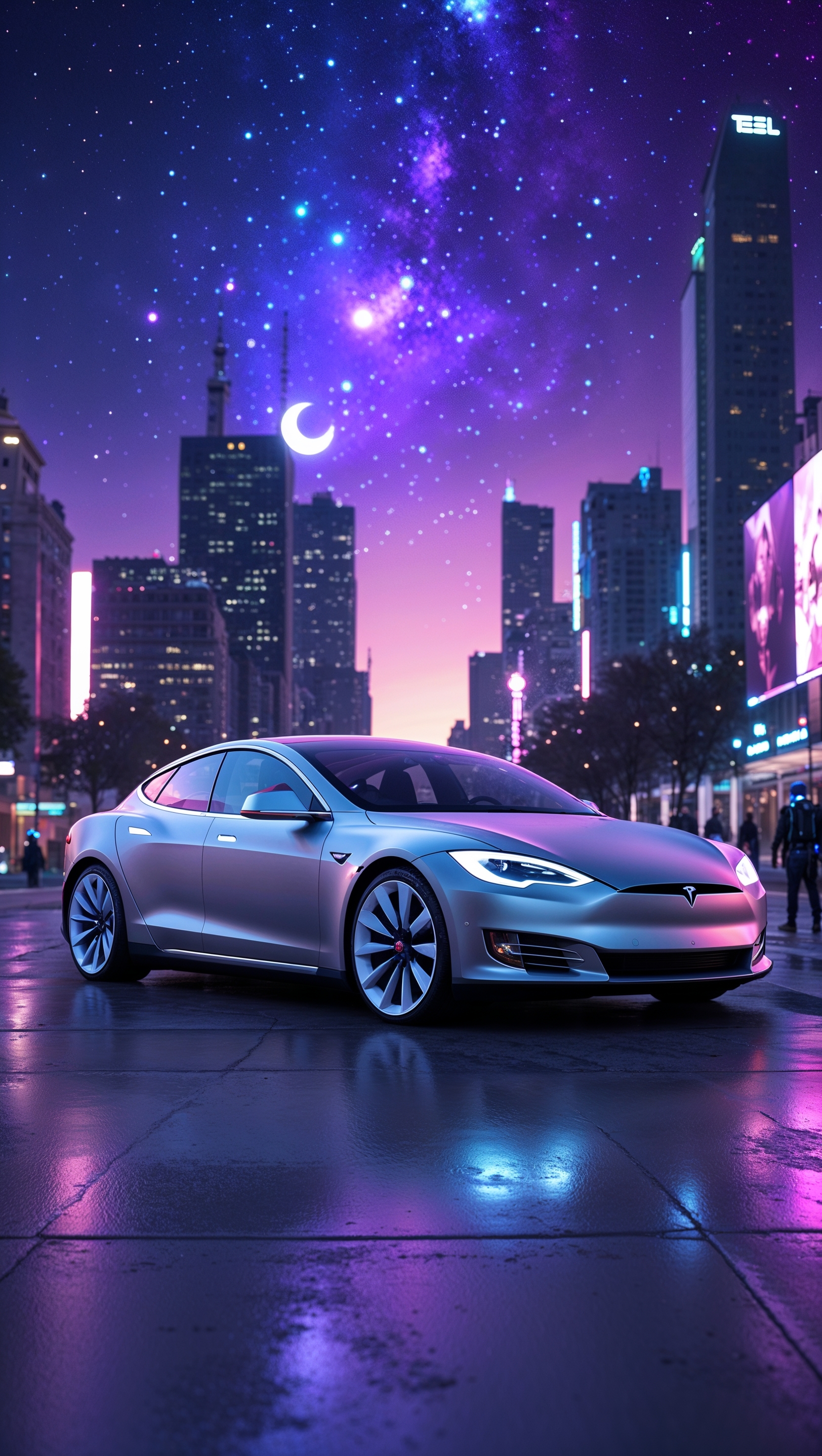 1664x2944 Tesla Model S in a futuristic city with a starry sky