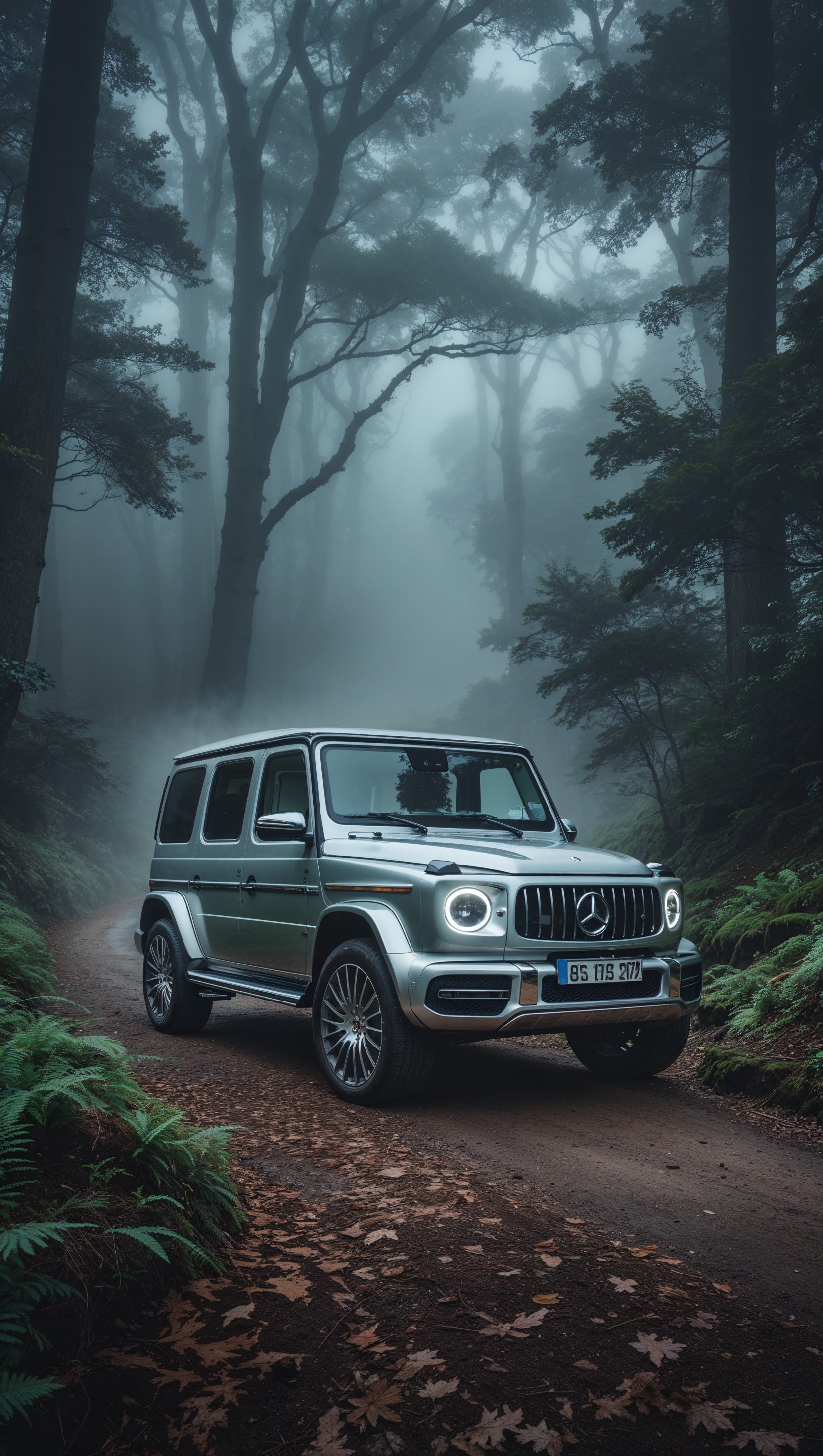 1664x2944 Mercedes G-Class in a foggy forest trail