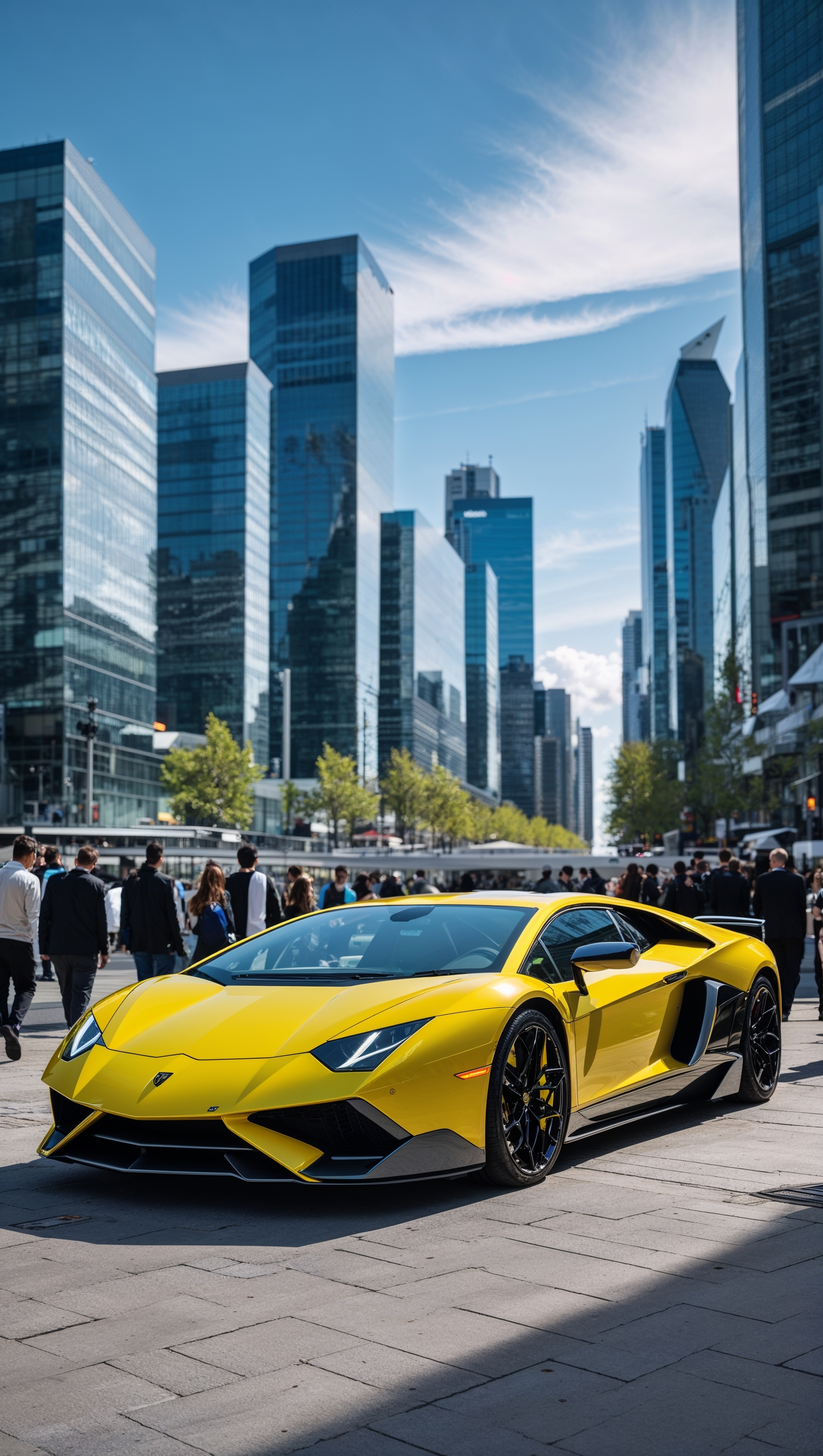 1664x2944 Yellow Lamborghini in front of modern skyscrapers