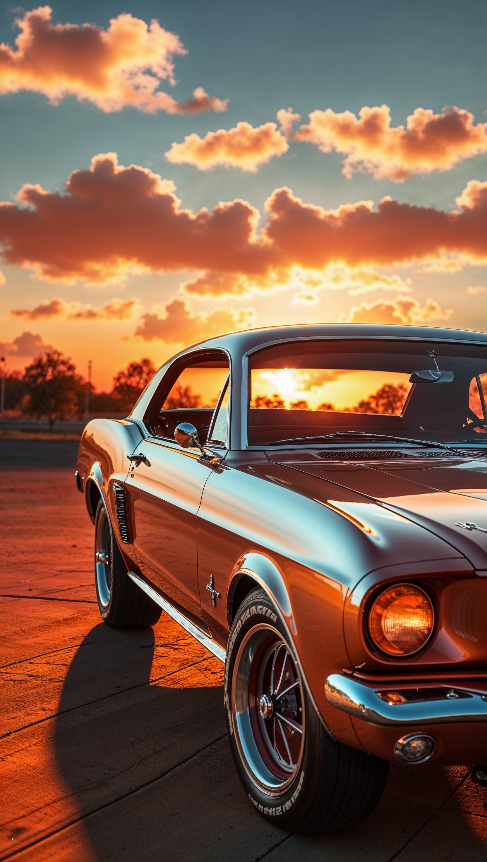 1664x2944 1960s classic car with an orange sunset background