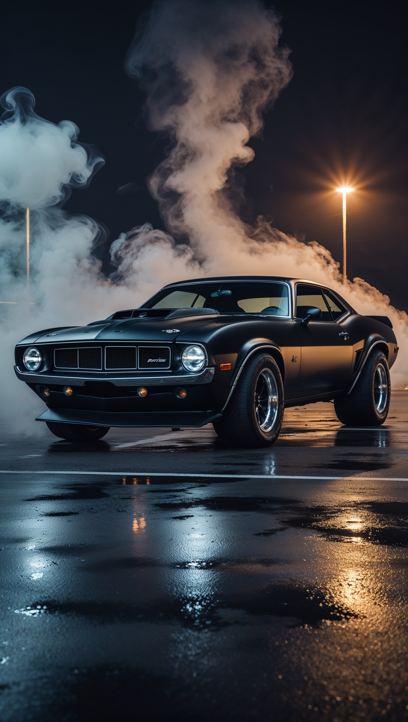 1664x2944 American muscle car in a dark parking lot with smoke