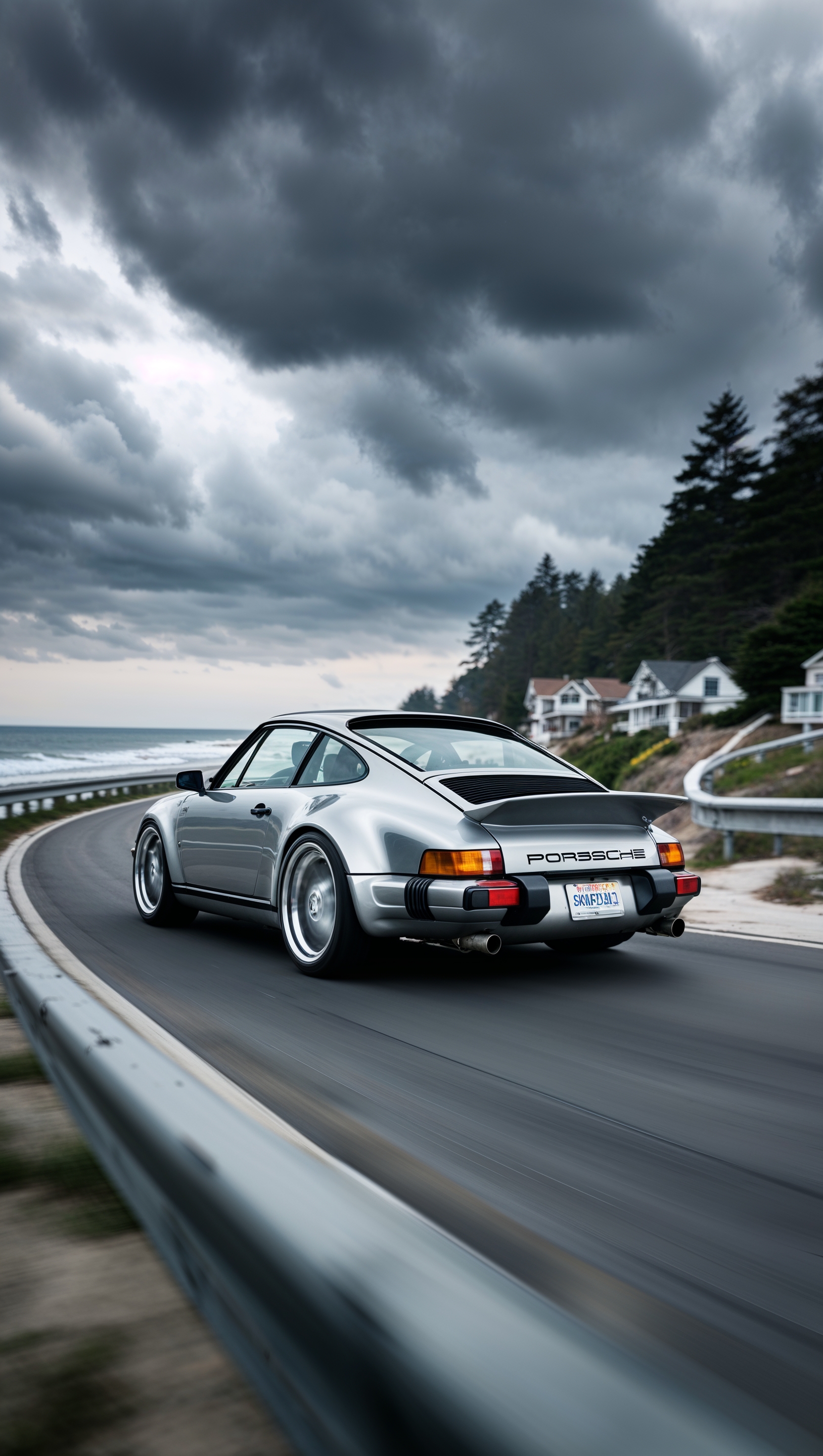 1664x2944 Porsche 911 on a coastal road in cloudy weather