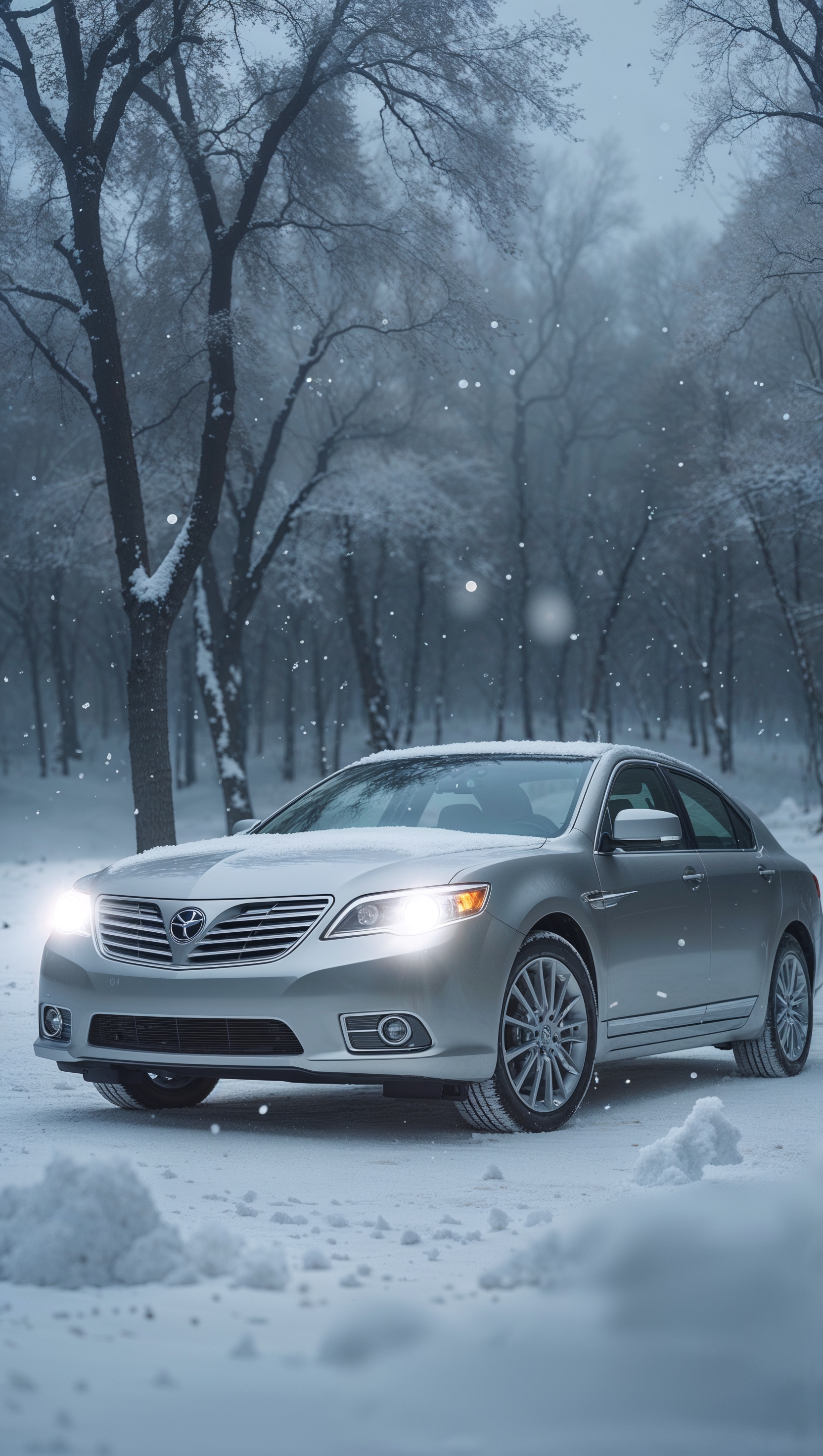 1664x2944 Car in a snowy landscape with headlights on