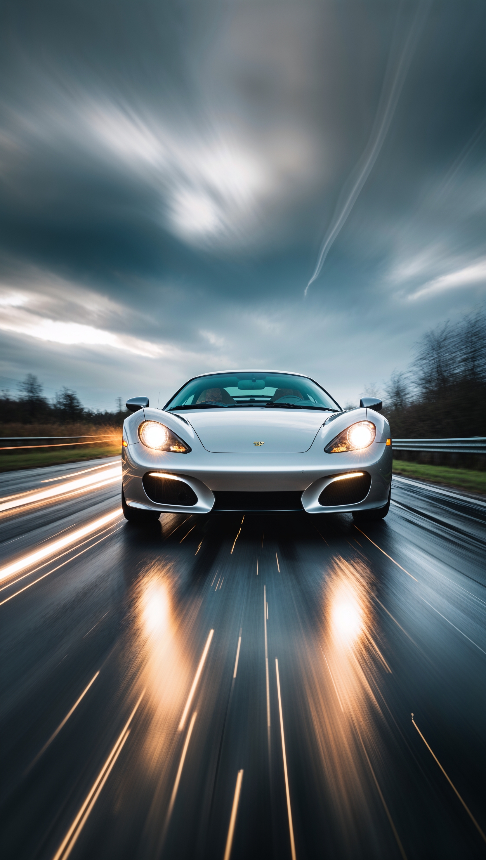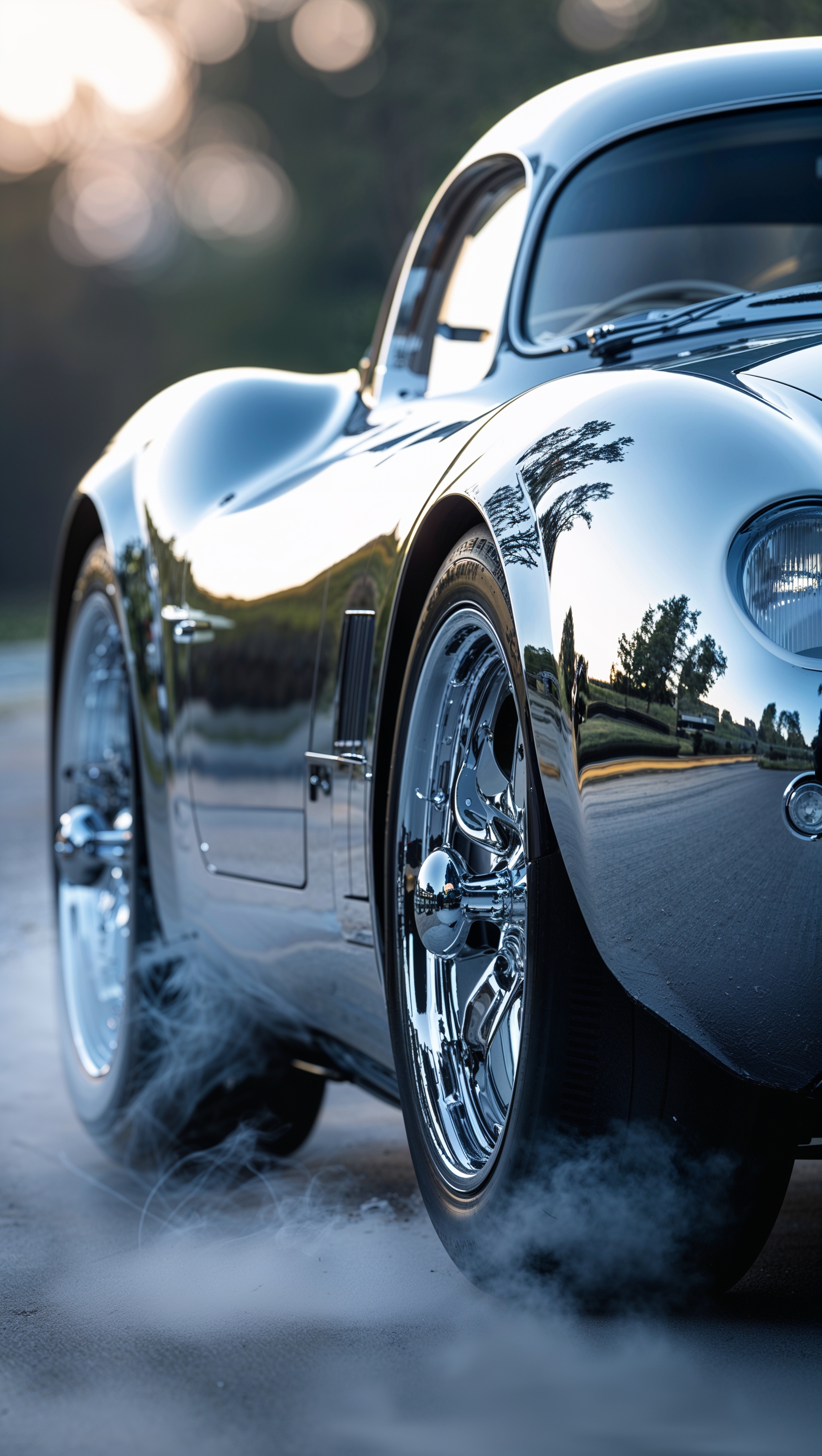 1664x2944 Sports car with a chrome body reflecting light