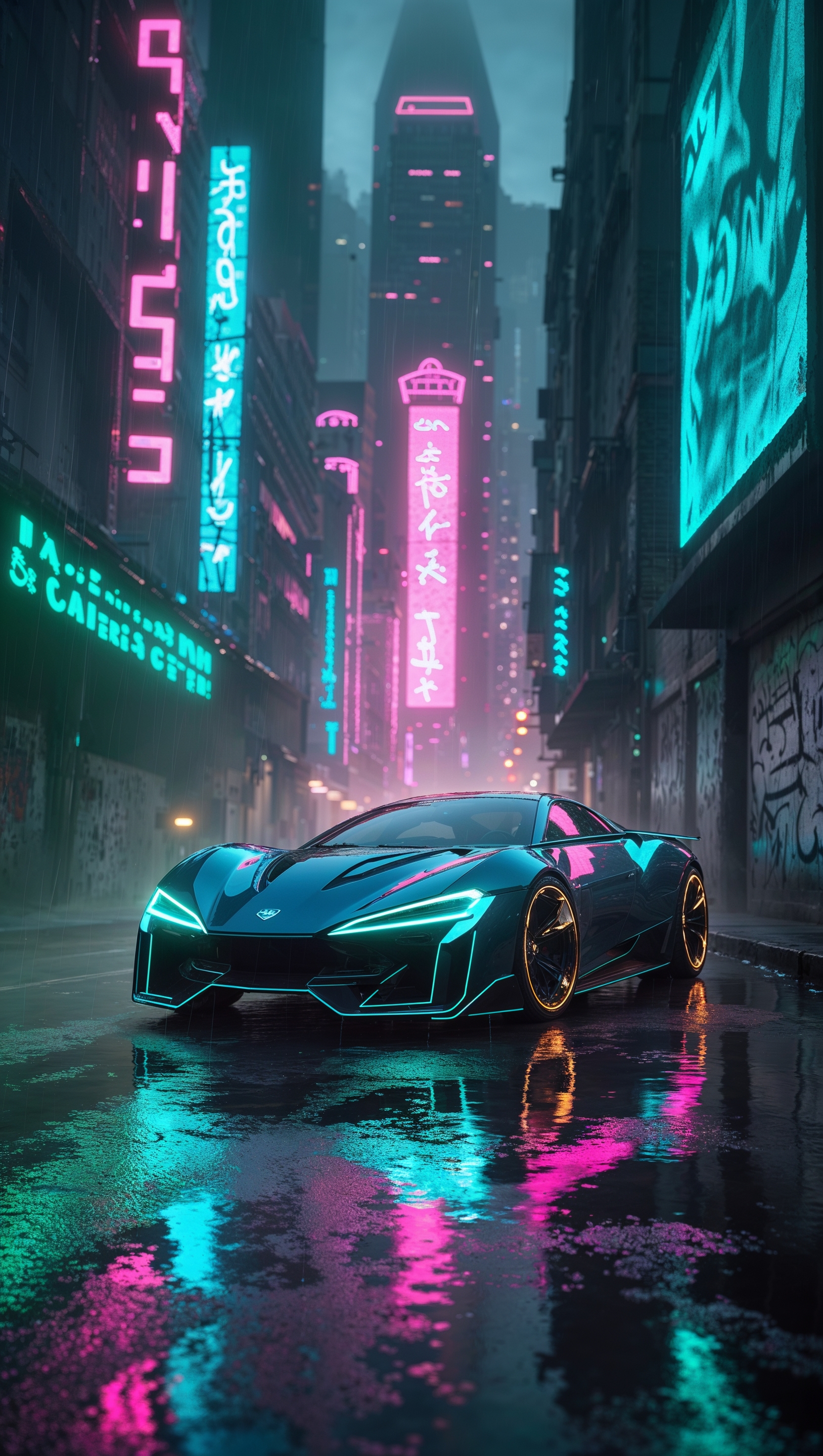 1664x2944 Cyberpunk-style car on neon-lit night streets