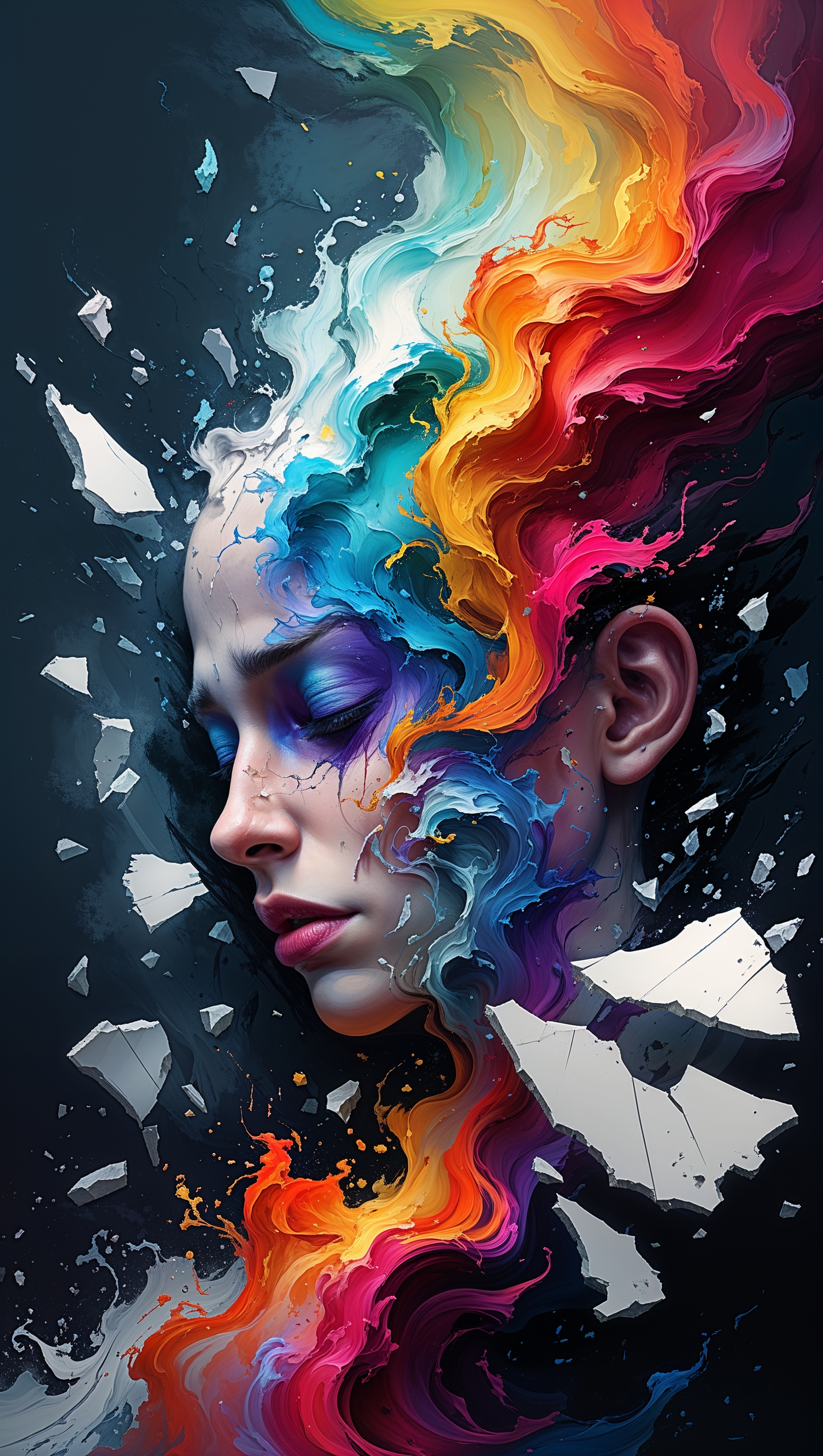 1664x2944 A digital art of a shattered mirror with a sad face reflection, iPhone wallpaper