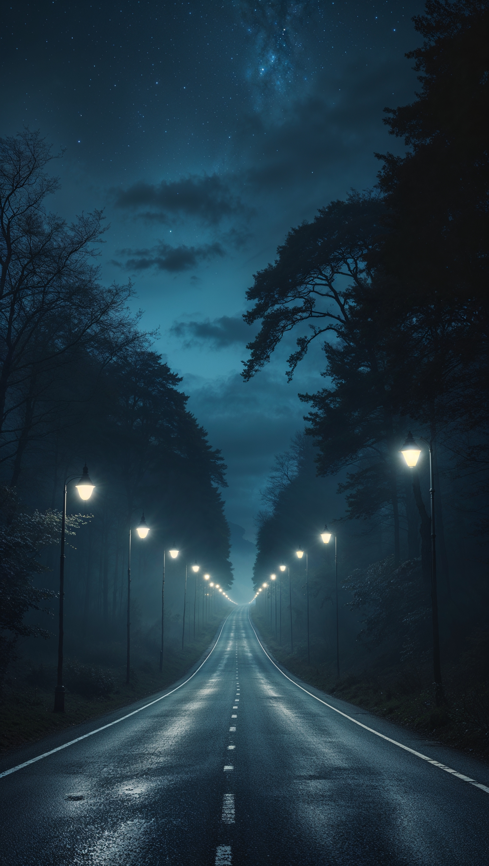 1664x2944 A lonely road disappearing into the night, misty and poetic, iPhone wallpaper