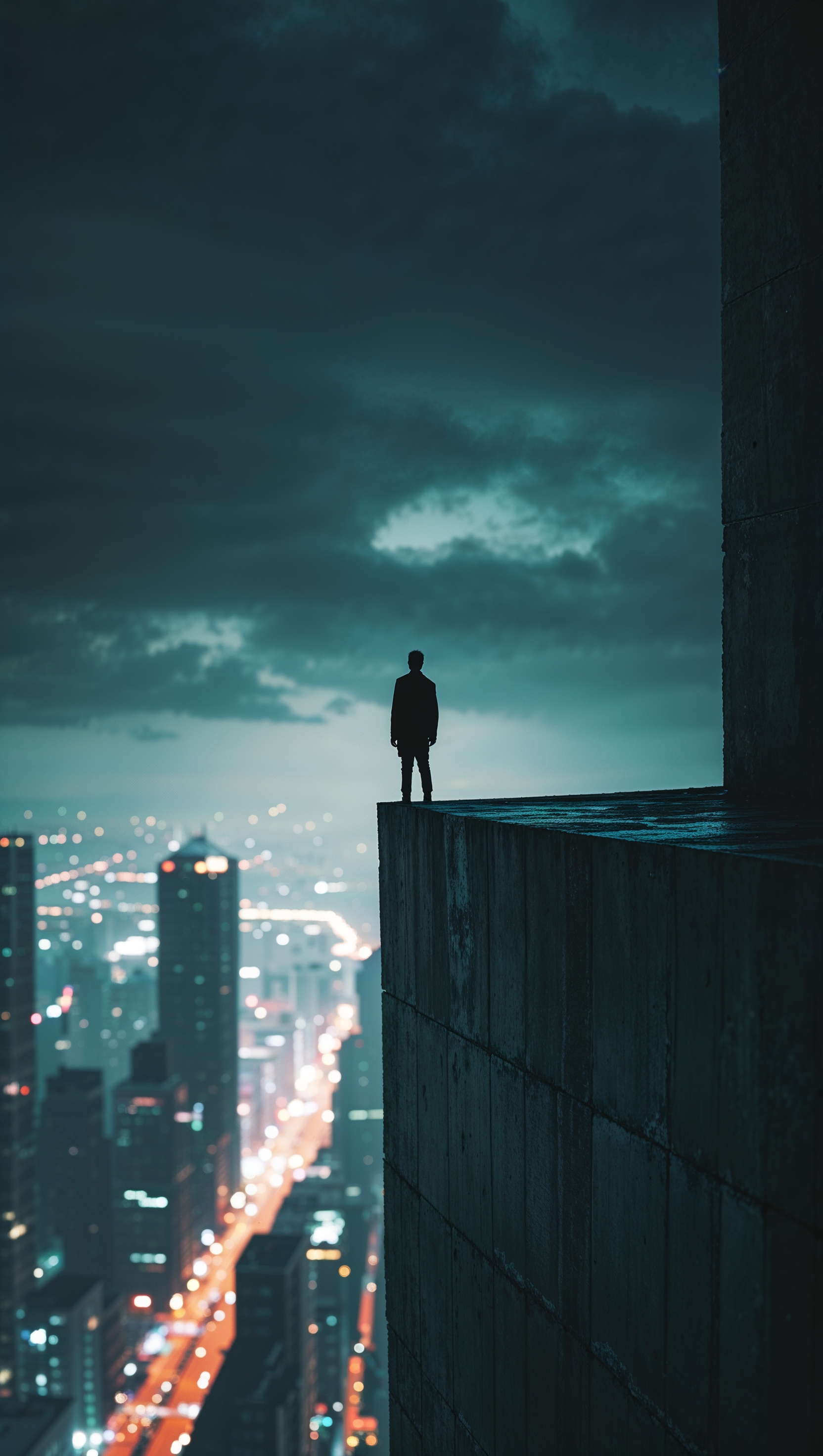 1664x2944 A dark and emotional iPhone wallpaper depicting a silhouette standing at the edge of a building at night