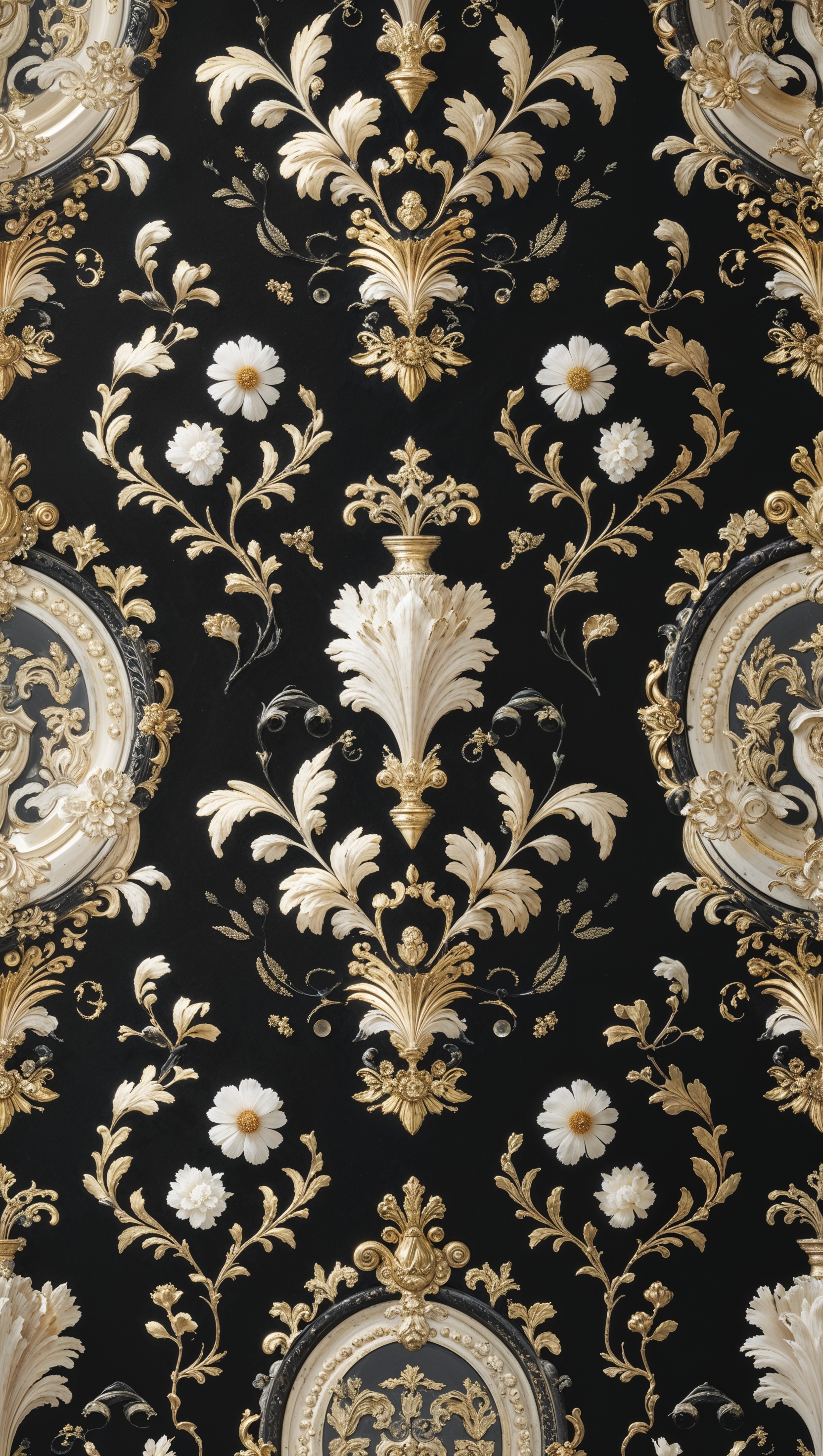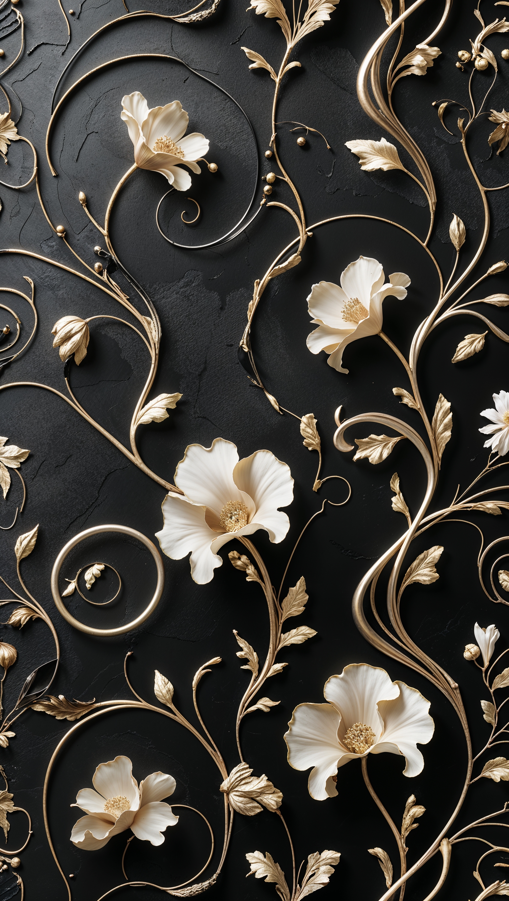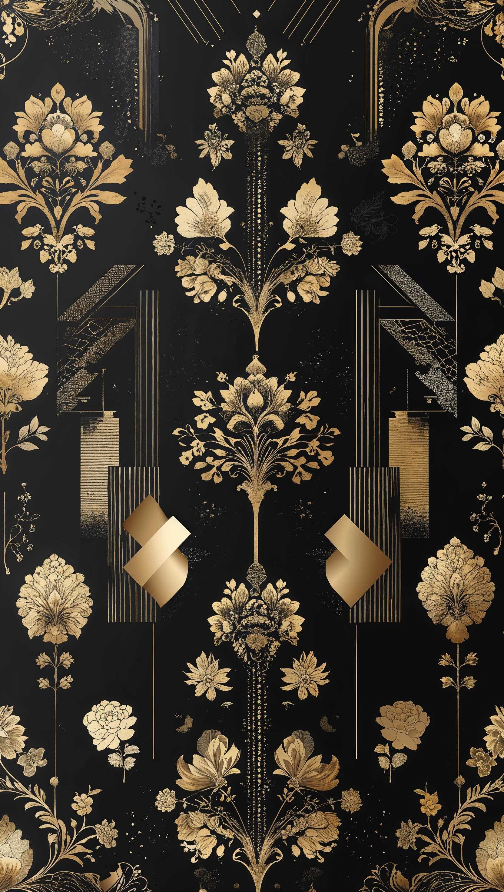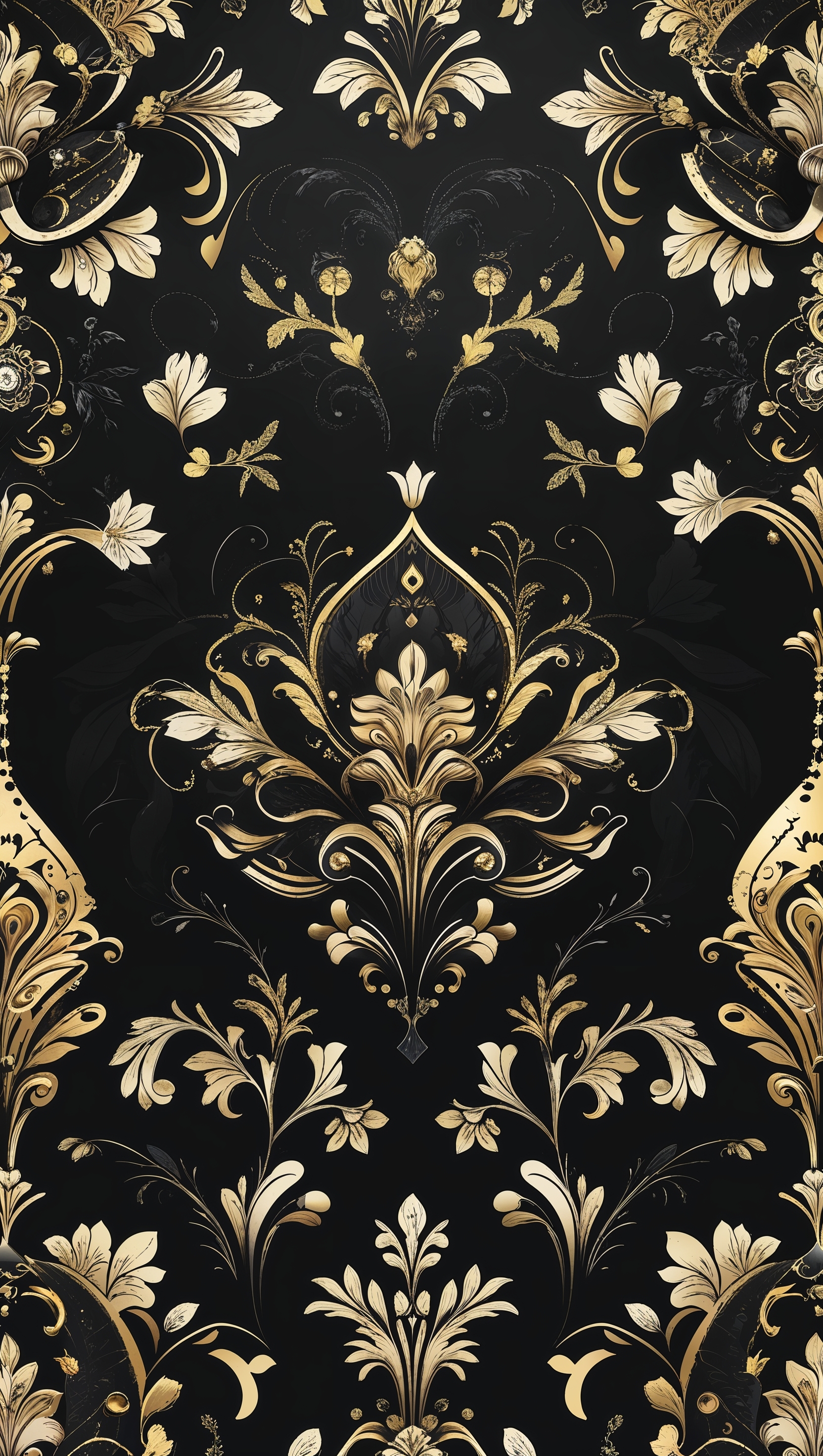 1664x2944 Design a black and gold wallpaper with floral decorations