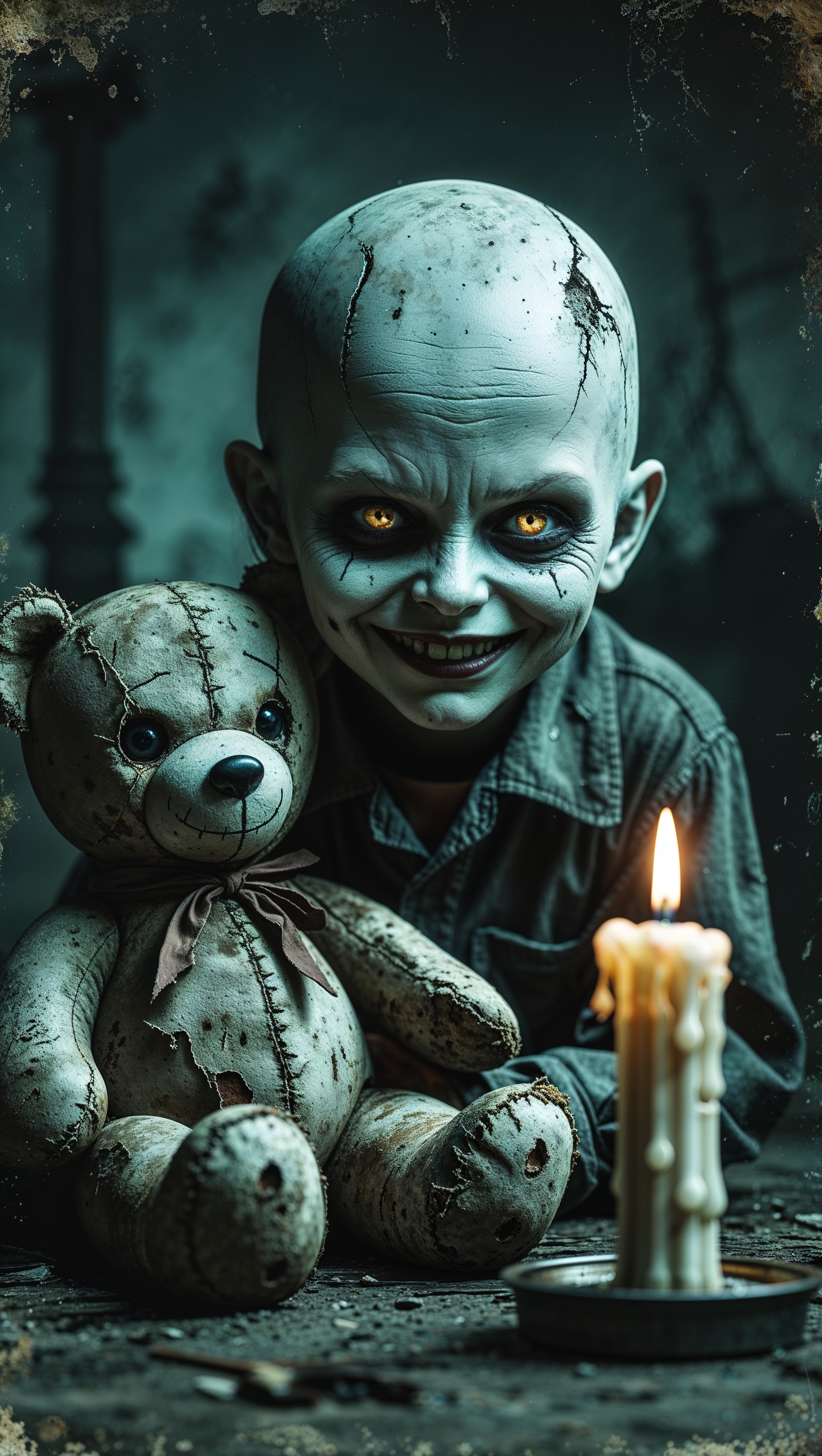 1664x2944 A creepy child holding a Korn teddy bear, horror theme, iPhone wallpaper