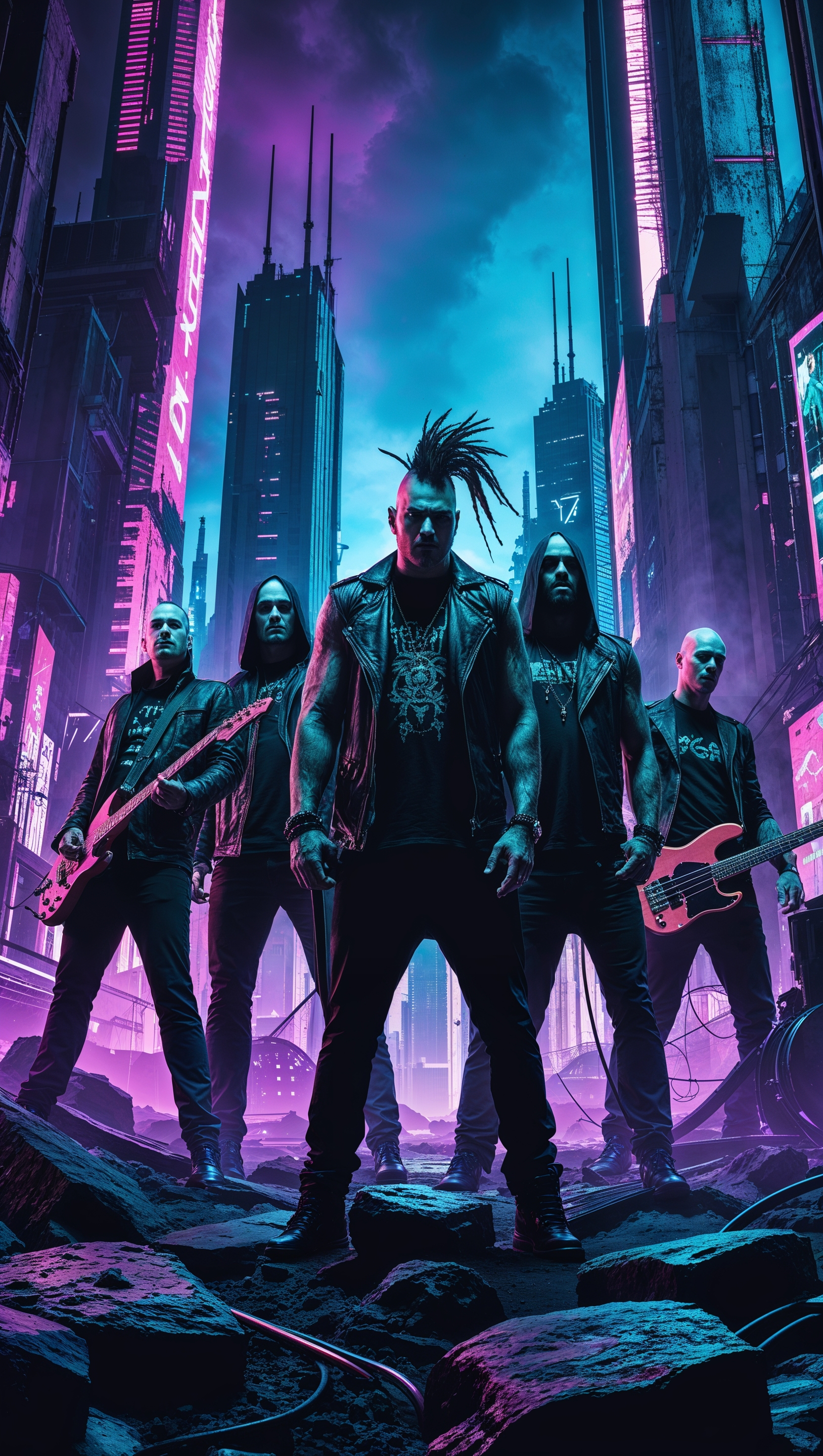 1664x2944 Korn band in dystopian city, cyberpunk style, iPhone wallpaper