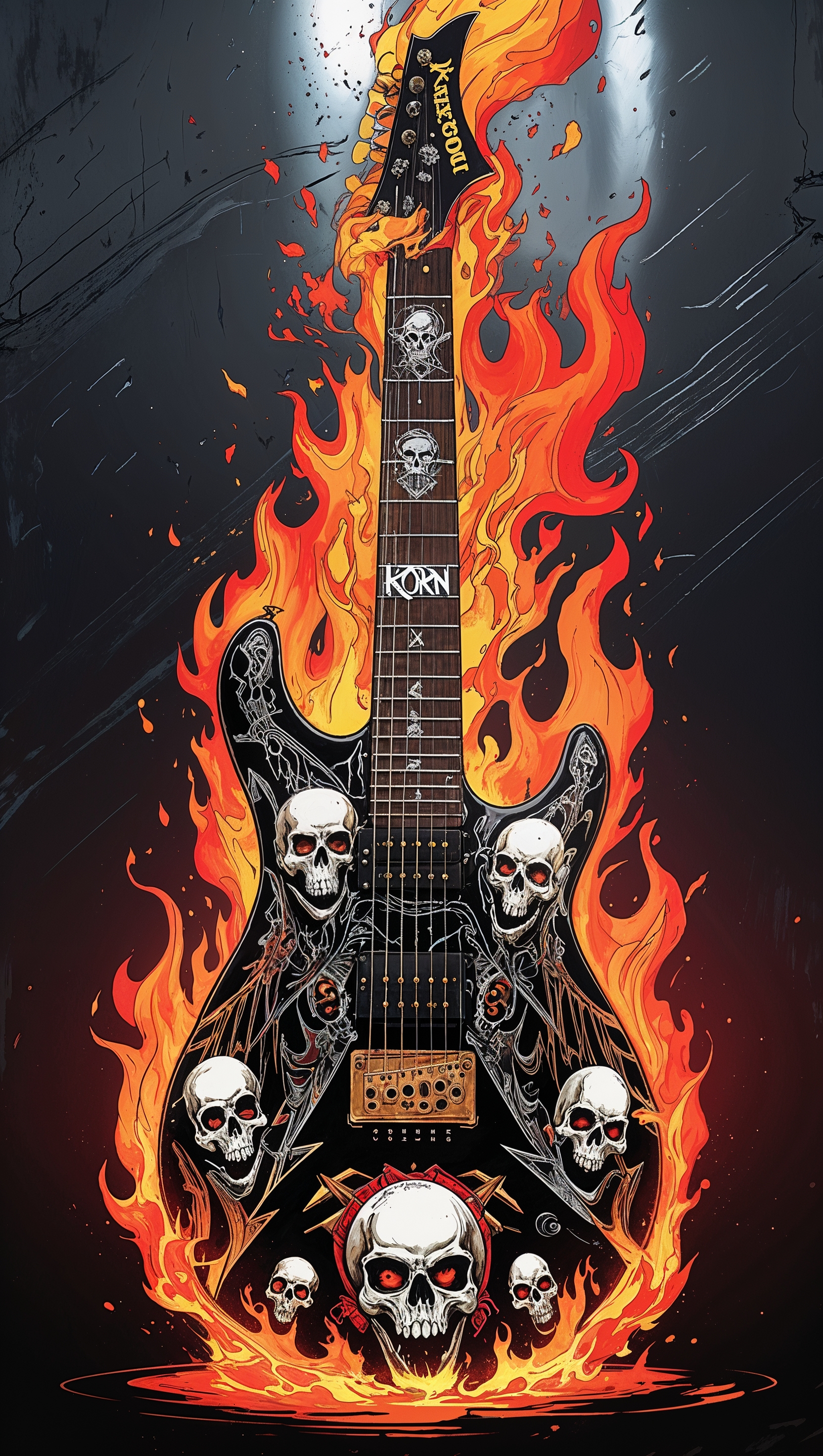 1664x2944 Korn guitar with flames and skulls, heavy metal style, iPhone wallpaper