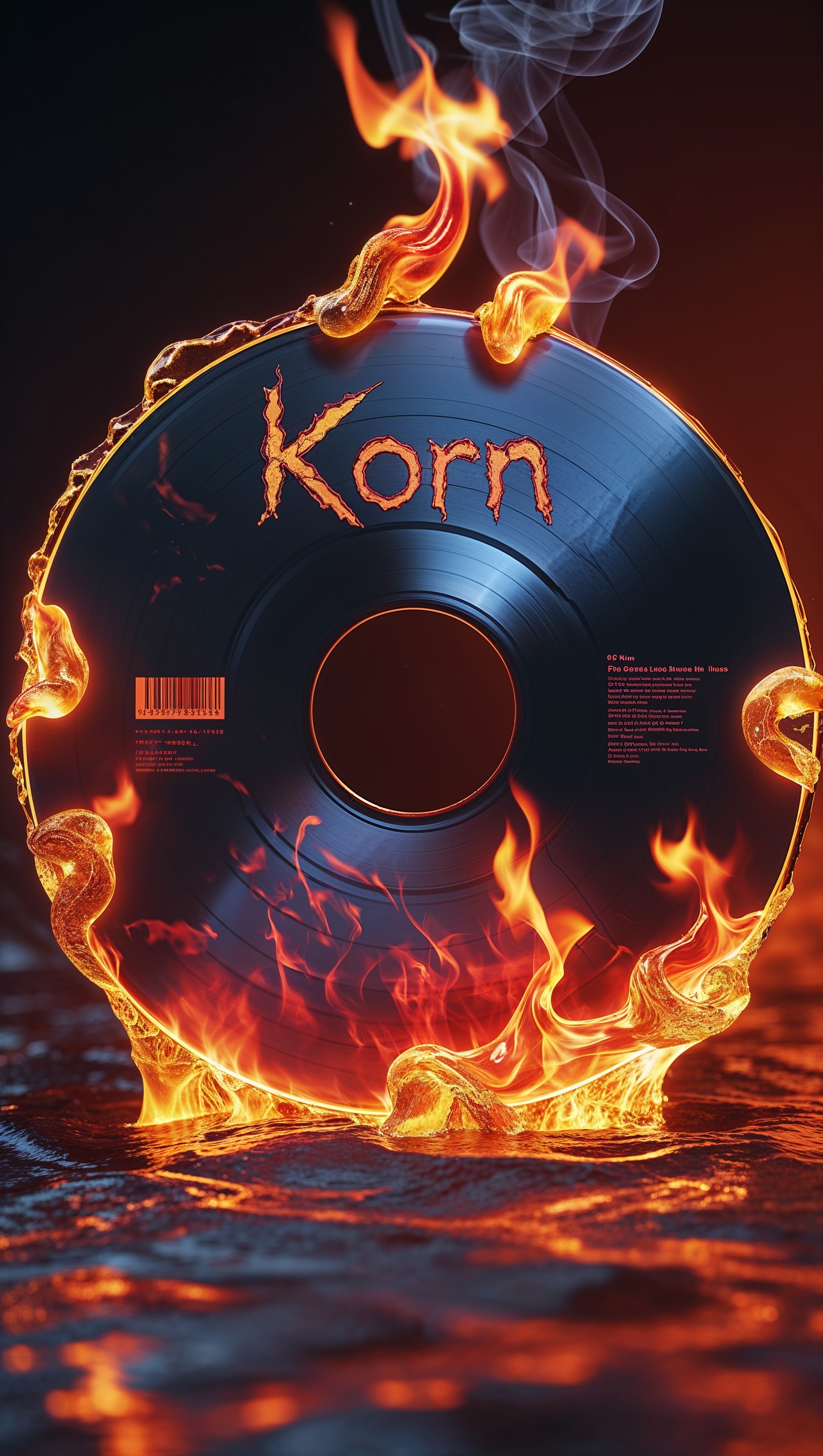 1664x2944 Korn album disc melting in fire, surreal image, iPhone wallpaper