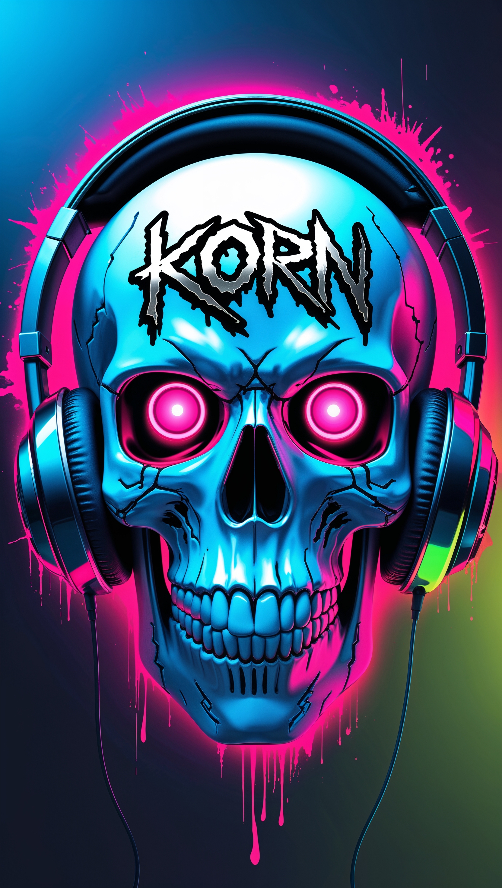 1664x2944 Stylized skull with headphones listening to Korn, neon colors, iPhone wallpaper