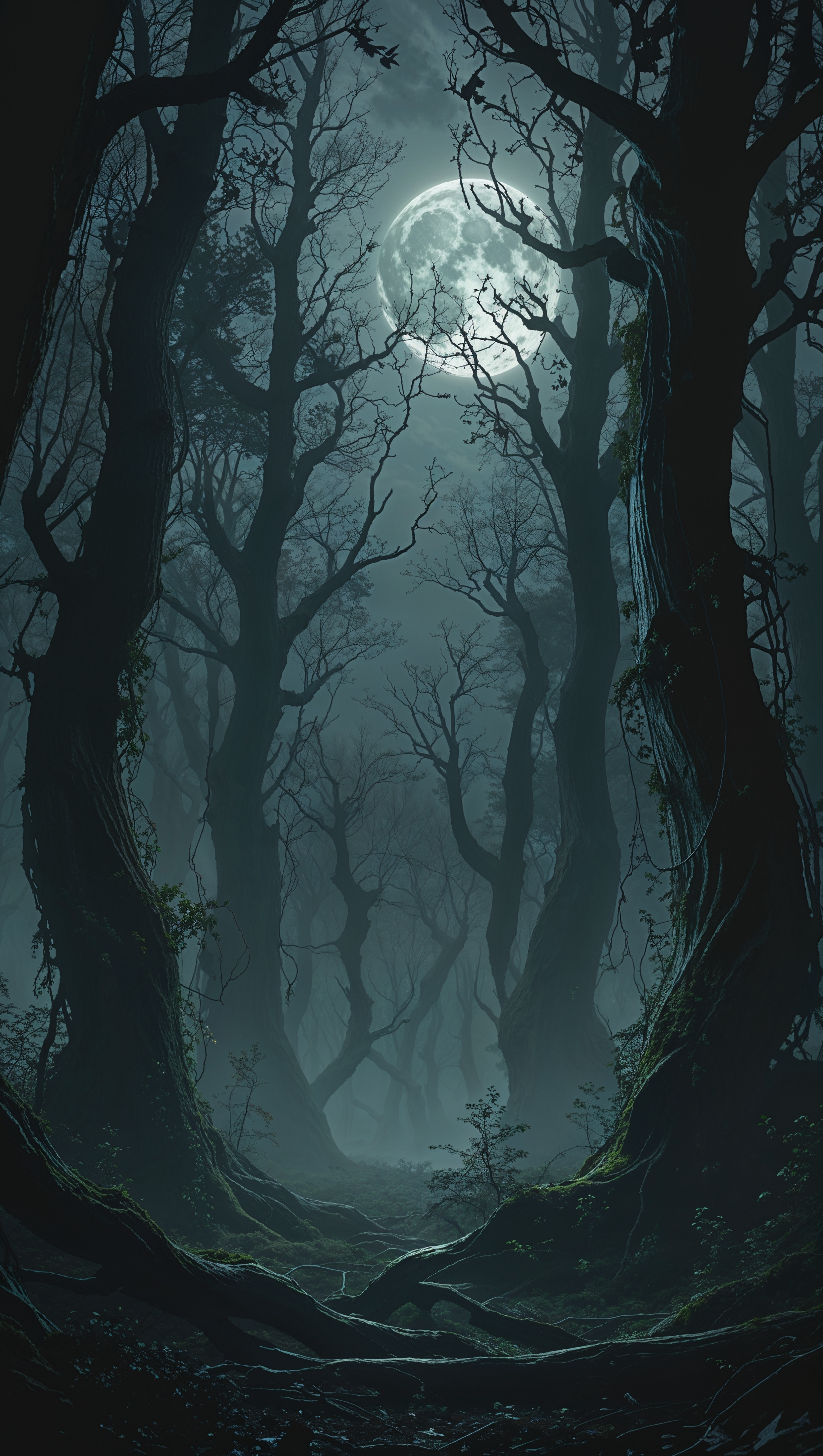1664x2944 Dark forest with hidden Korn symbol on trees, mysterious tone, iPhone wallpaper
