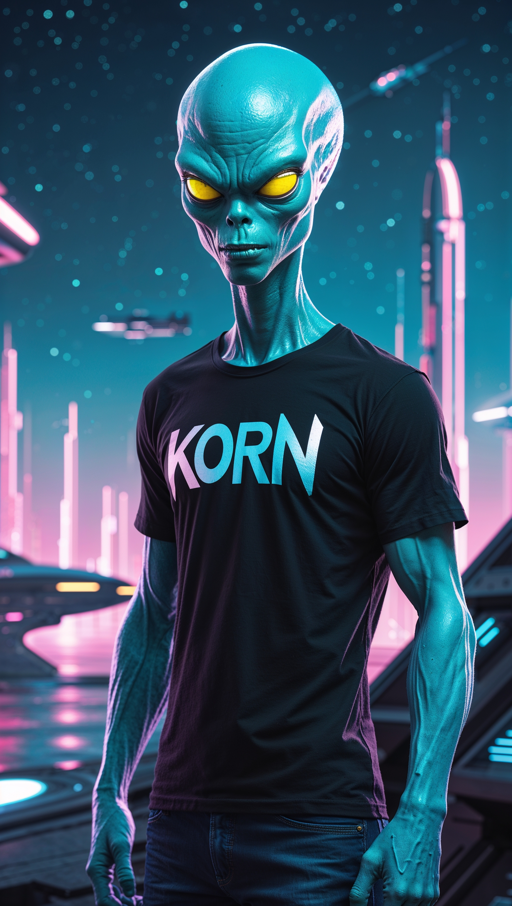1664x2944 Alien creature wearing Korn shirt, sci-fi theme, iPhone wallpaper