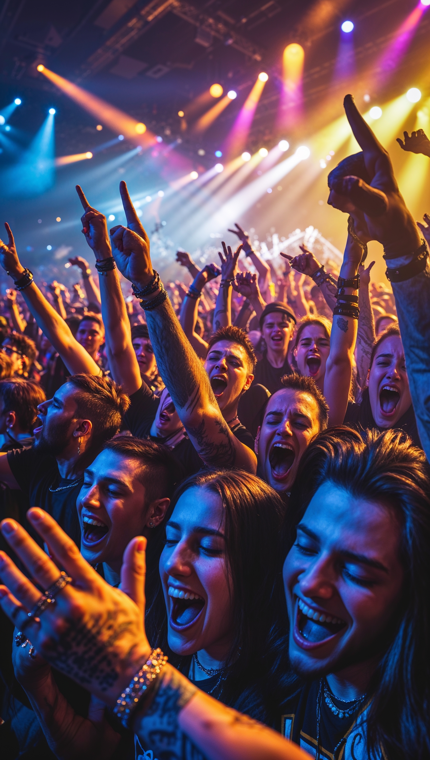 1664x2944 Korn fans at concert raising hands, backlit by stage lights, iPhone wallpaper