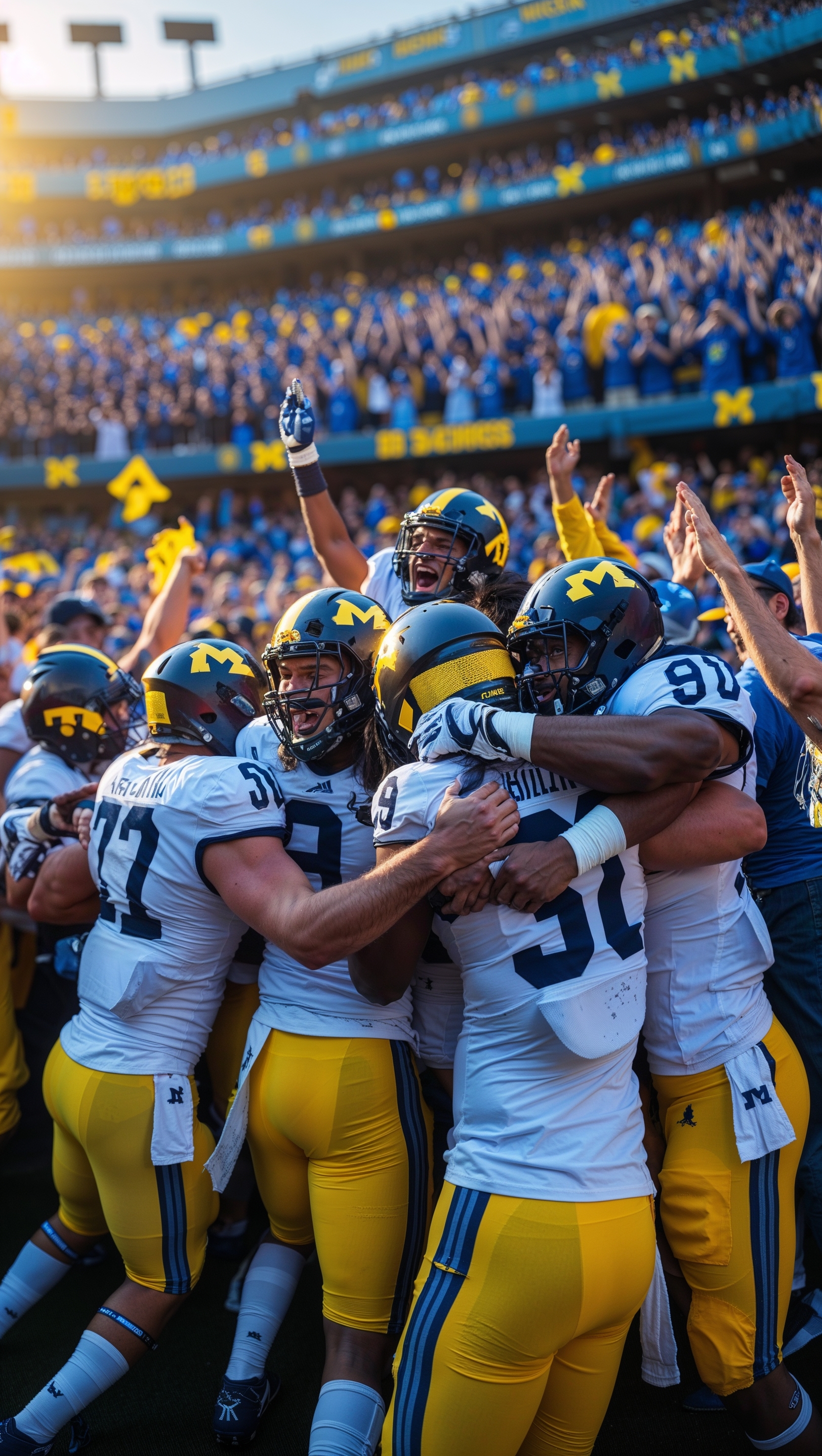 1664x2944 An image of Michigan football players celebrating a victory on the field