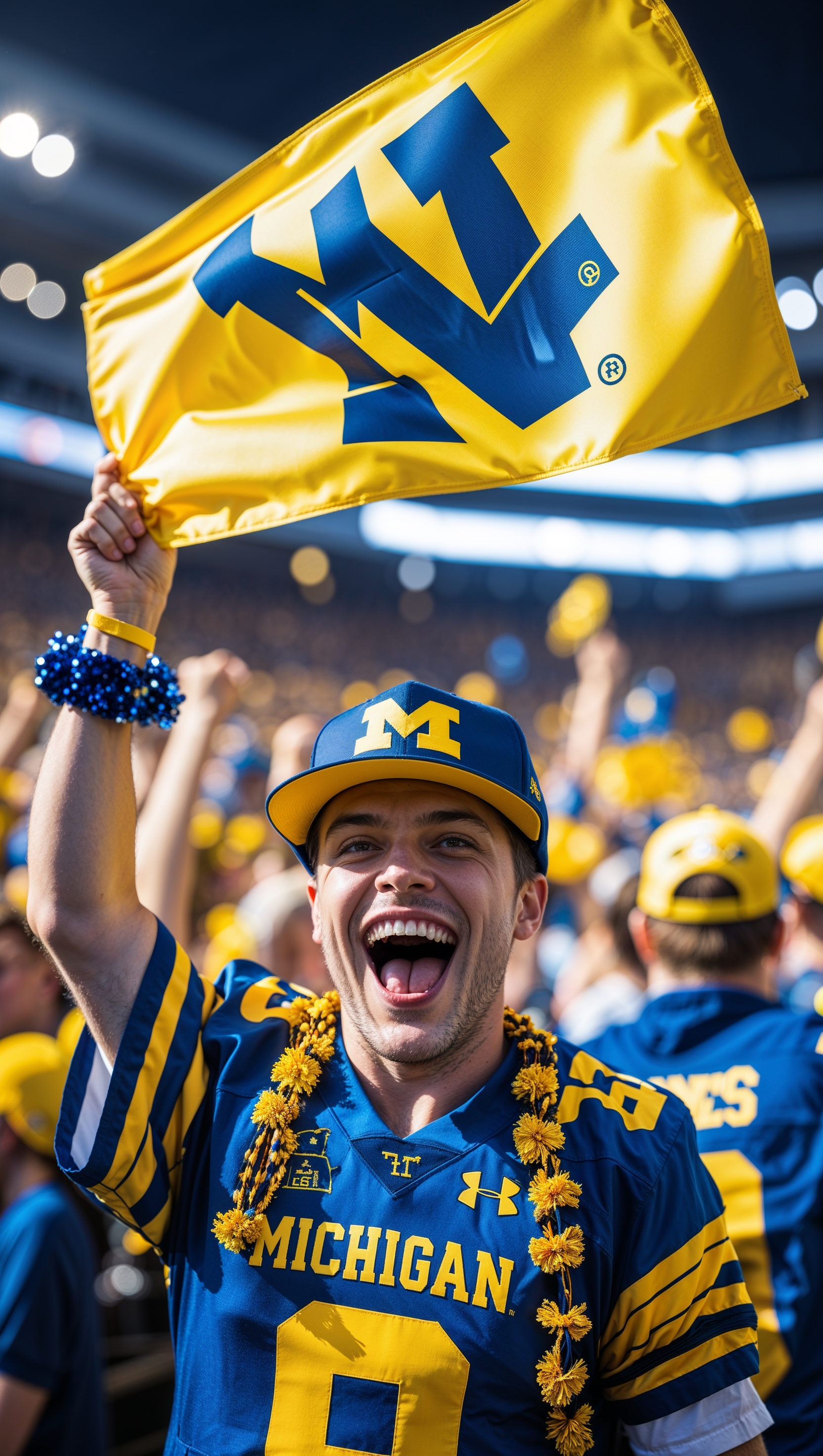 1664x2944 An image of a Michigan football fan displaying a flag and wearing team gear