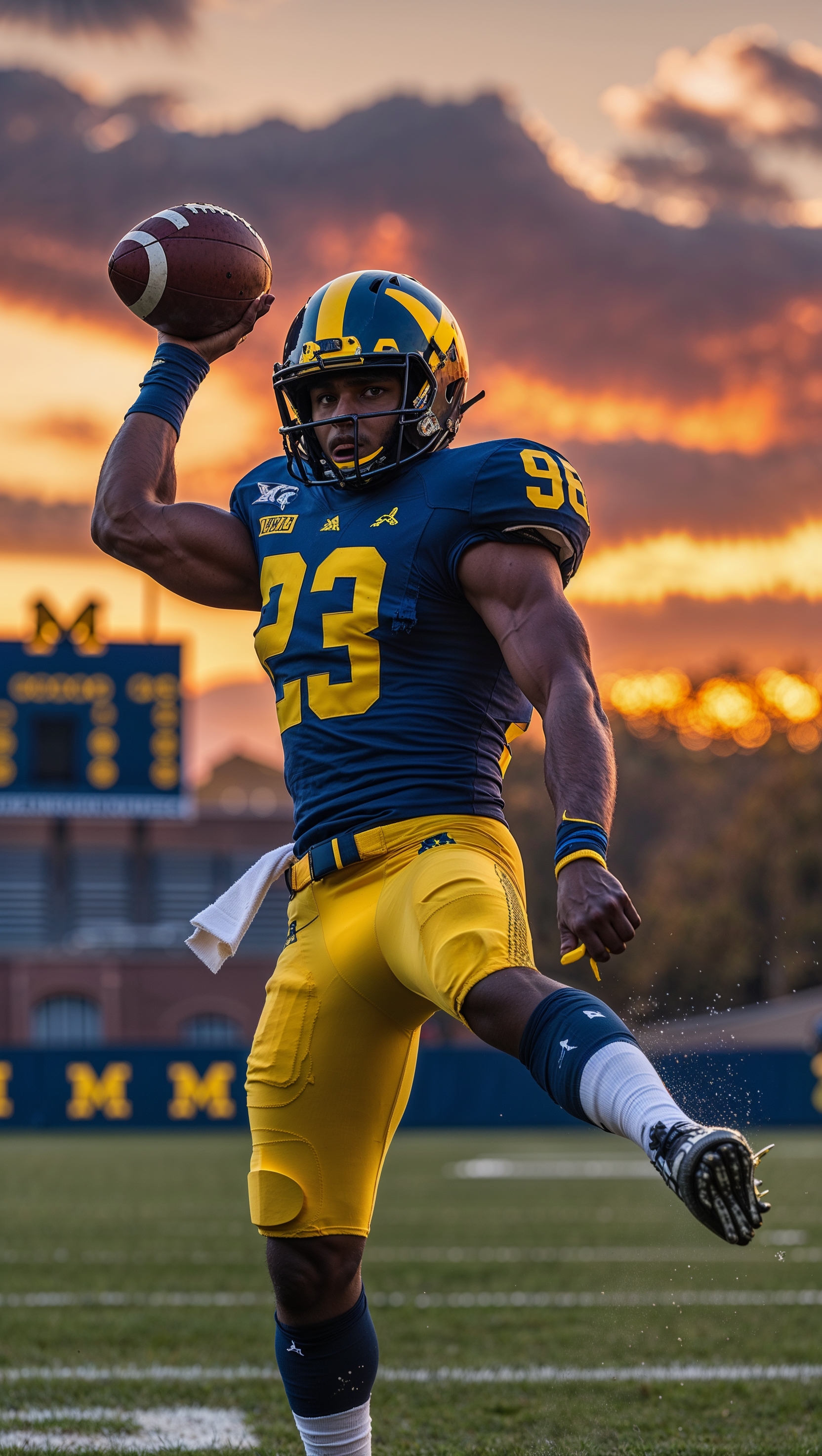 1664x2944 An image of a Michigan football player kicking the ball with a sunset background
