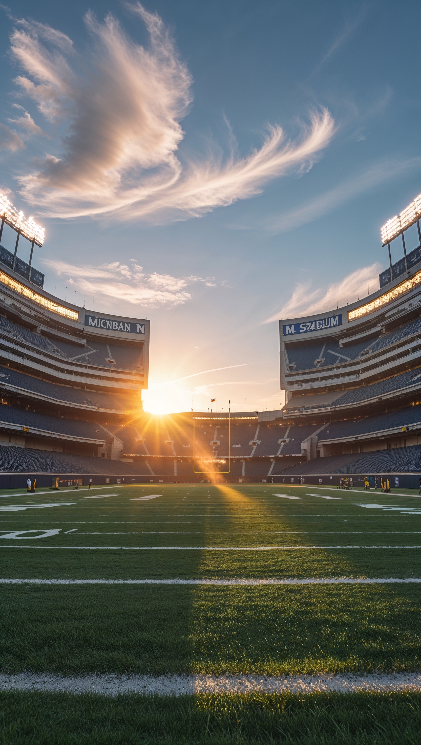 1664x2944 An image of Michigan stadium early in the morning with golden sunlight on the field