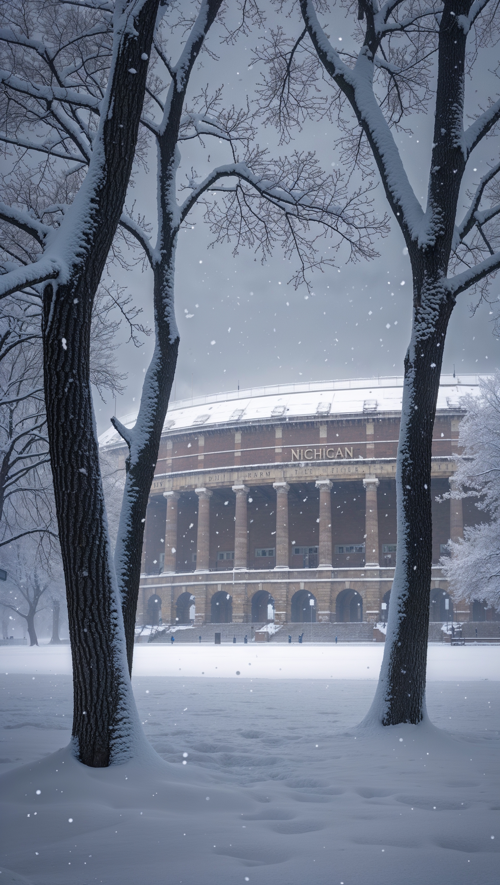 1664x2944 An image of snow-covered trees next to Michigan stadium in winter