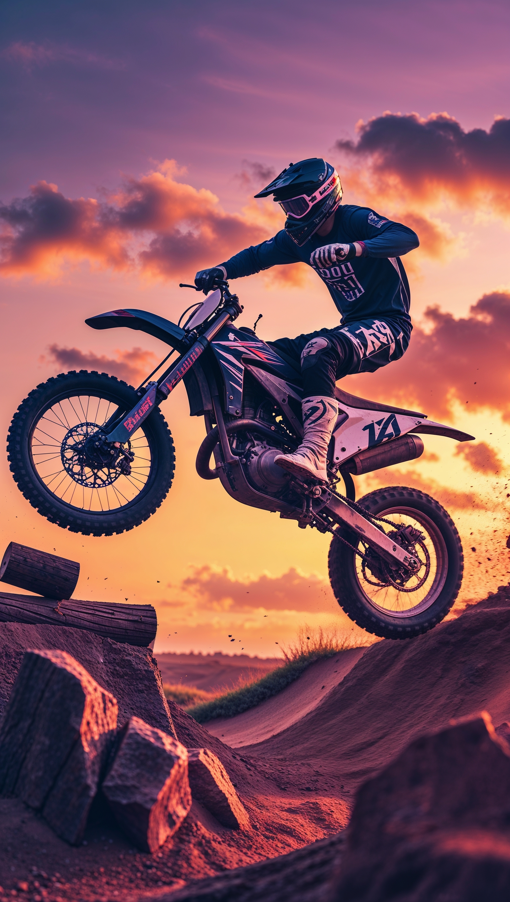 1664x2944 A dirt bike jumping over obstacles with a sunset in the background, for an iPhone wallpaper