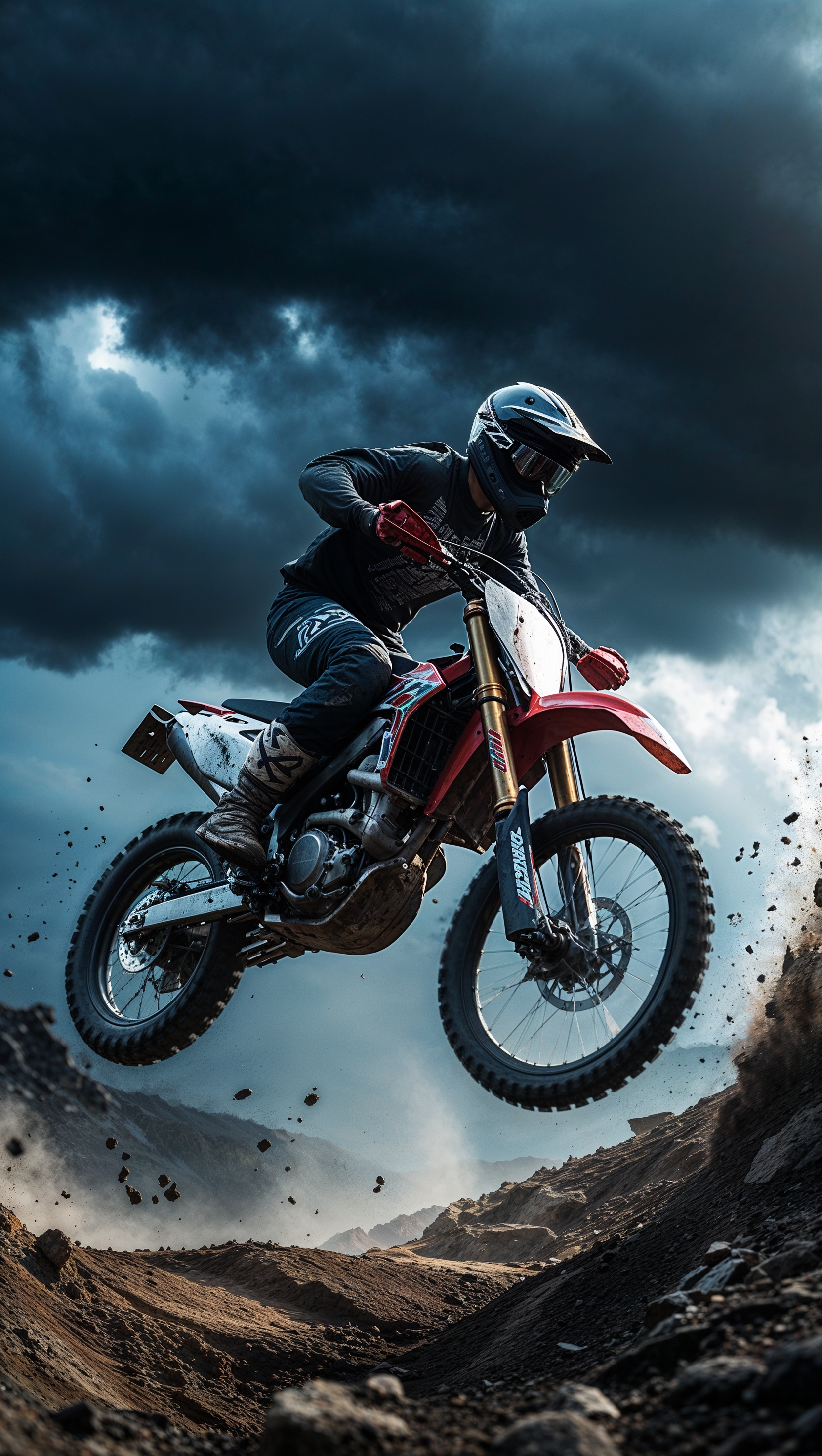 1664x2944 An image of a dirt bike riding on a tough trail with dark skies and storm clouds, for an iPhone wallpaper